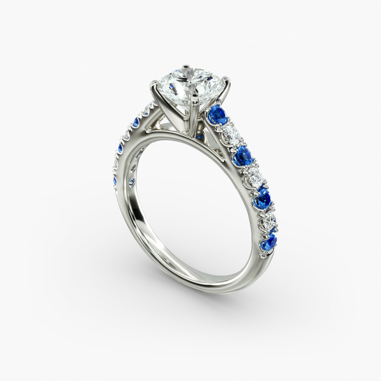 This striking platinum setting features alternating pavé-set sapphires and round diamonds; the perfect complement to your choice of center diamond.