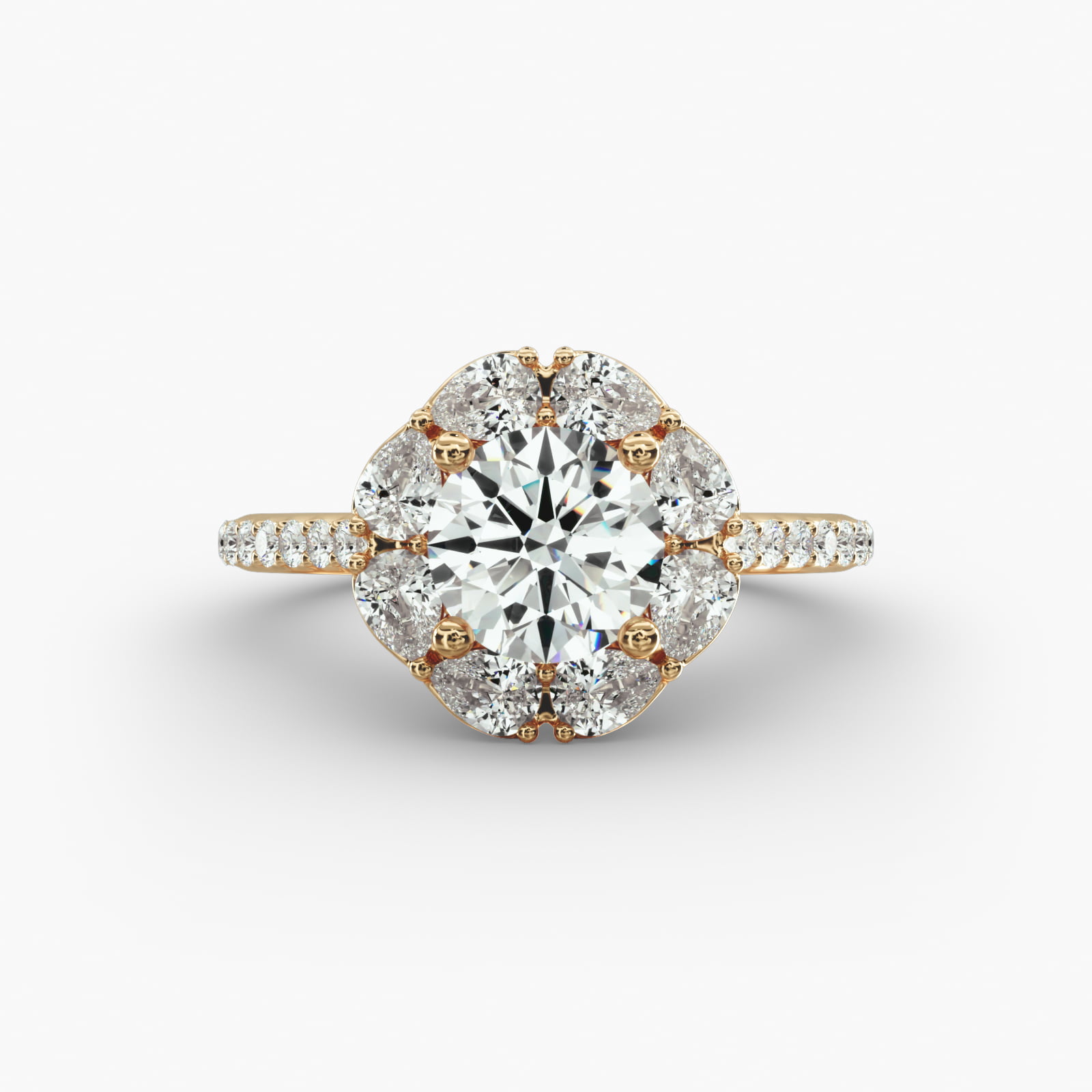 Pay tribute to the one you love with the elegant and graphic lines of this 14k white gold engagement ring punctuated by a luxurious display of round- and pear-cut diamonds encircling your choice of emerald-cut center stone. Its light-filled halo reflects beautifully upon a diamond-encrusted band and swirling shank.