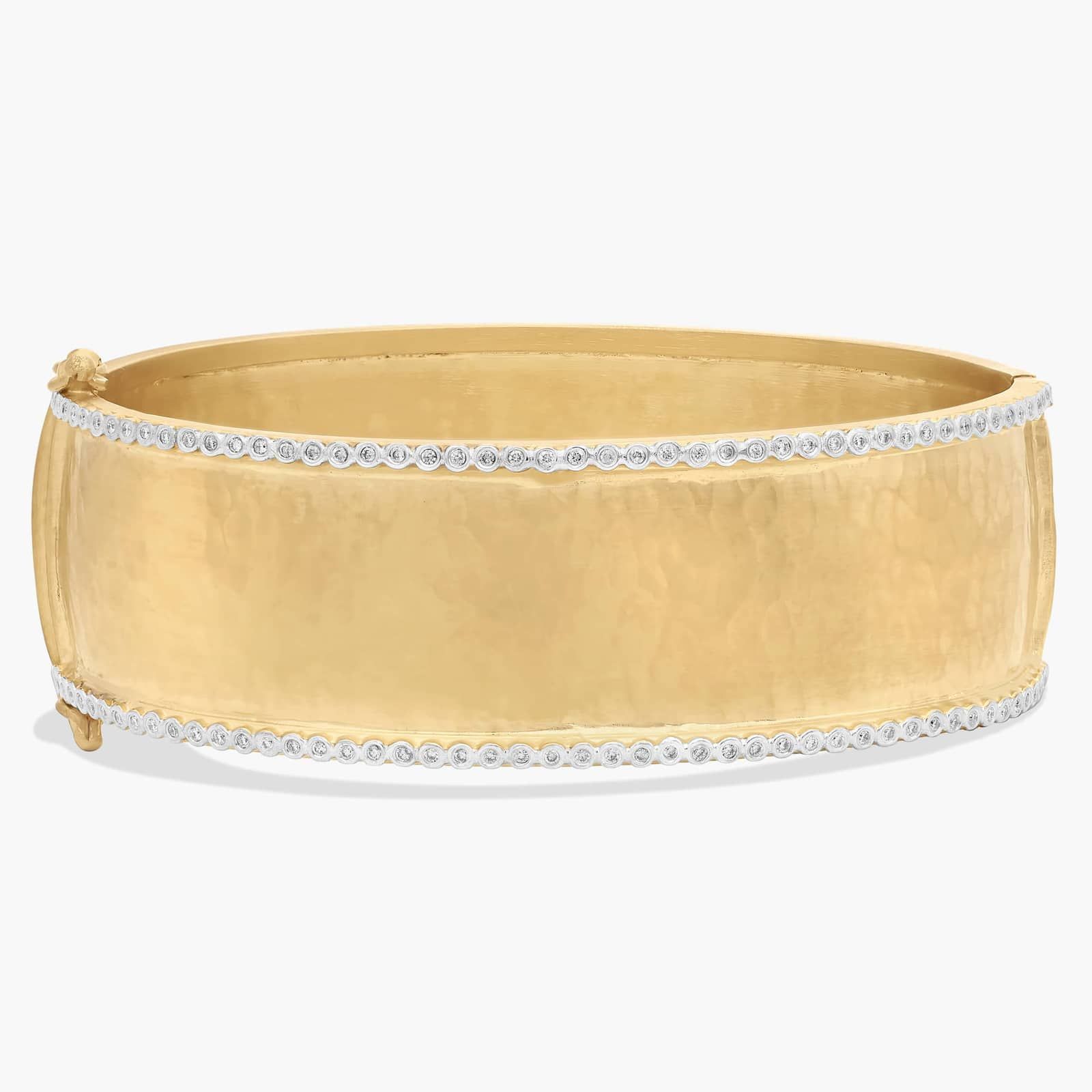 Hammered 14k gold and diamond details bring beautiful textural contrast to this bangle. With a hinged closure, it’s secure and easy to wear. Add signature style to your jewelry collection with this hammered gold and diamond bangle.