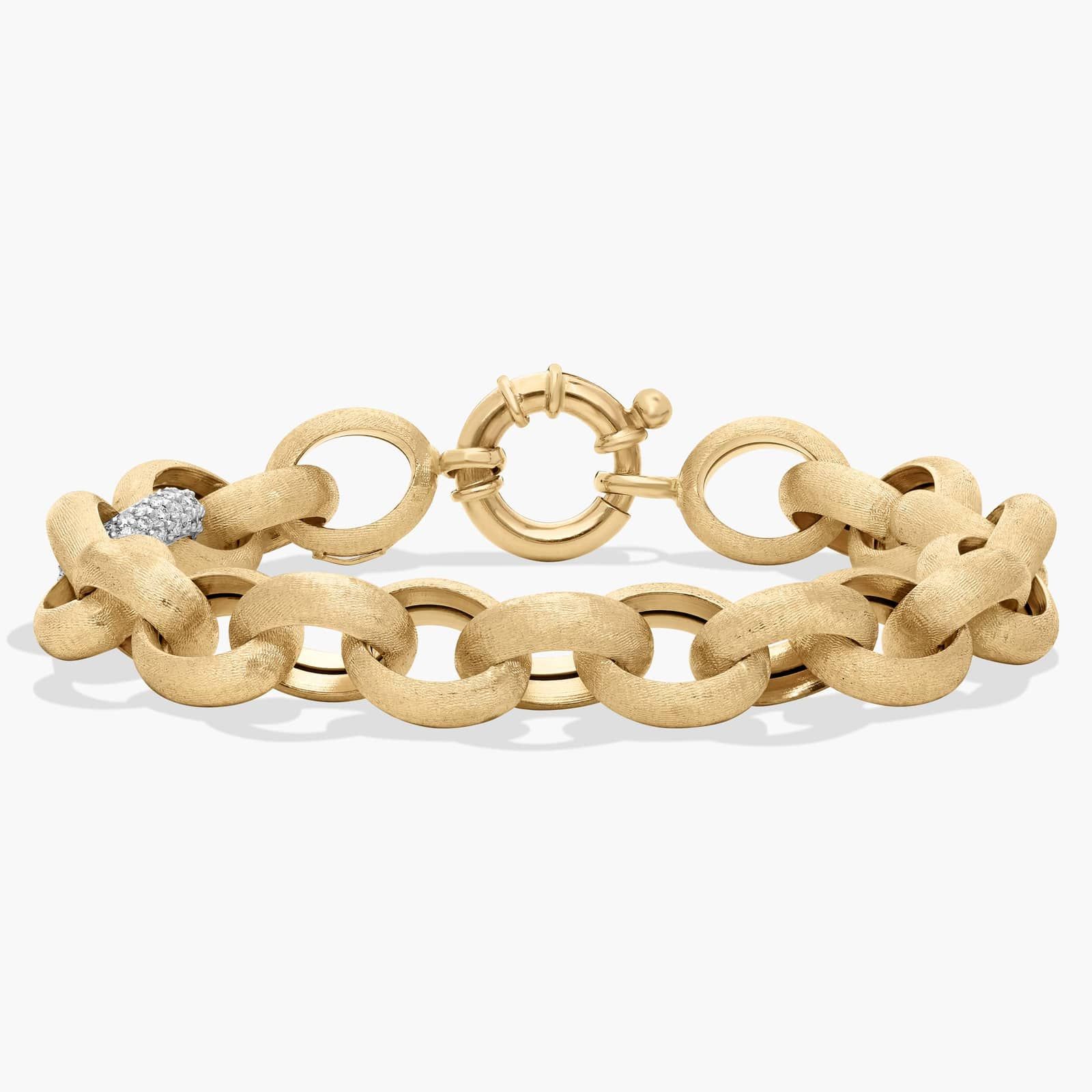 This two-tone cable link bracelet combines polished and brushed details to create a stylish textural contrast. This 14k gold bracelet features the brilliance of diamonds along with classic cable link styles that make it a go-to accessory for any occasion.