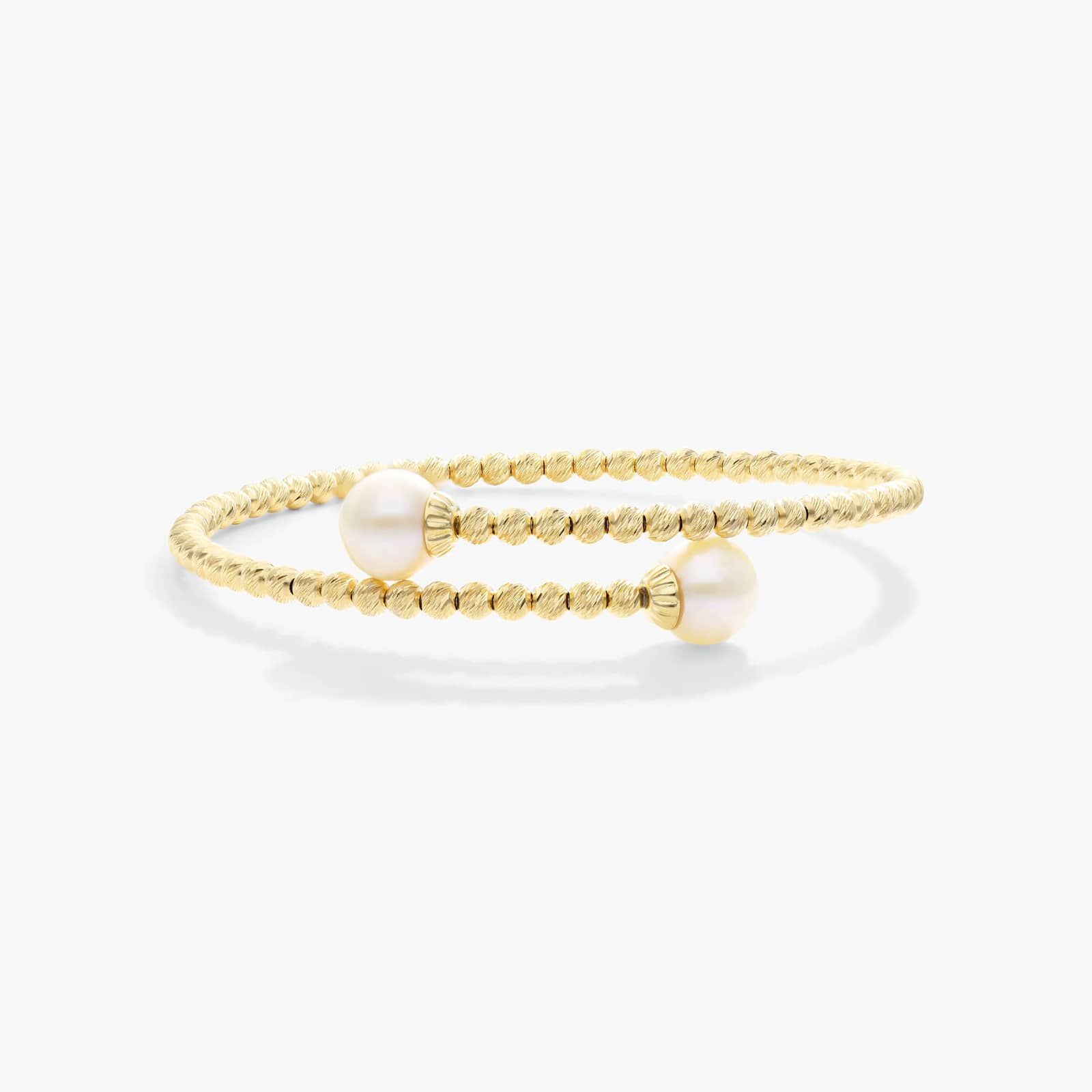 This beautiful bangle is composed of textured 14K yellow gold brilliance beads and joined together by two lustrous 8-8.5mm freshwater pearls.