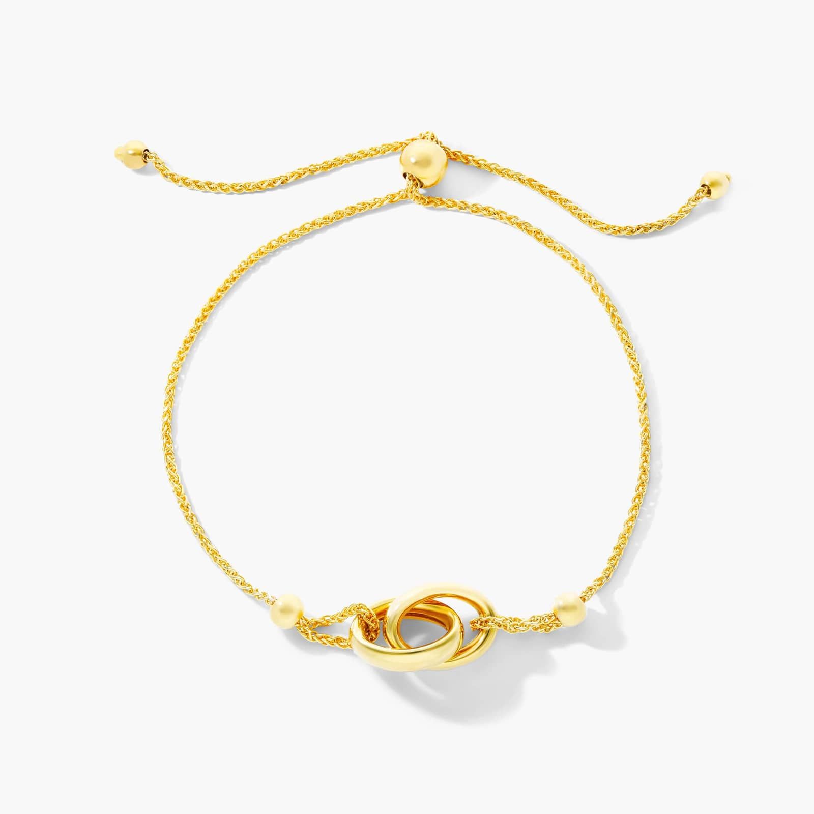 This 14K gold adjustable bolo bracelet features two interlocked circles to symbolize an ever lasting connection.