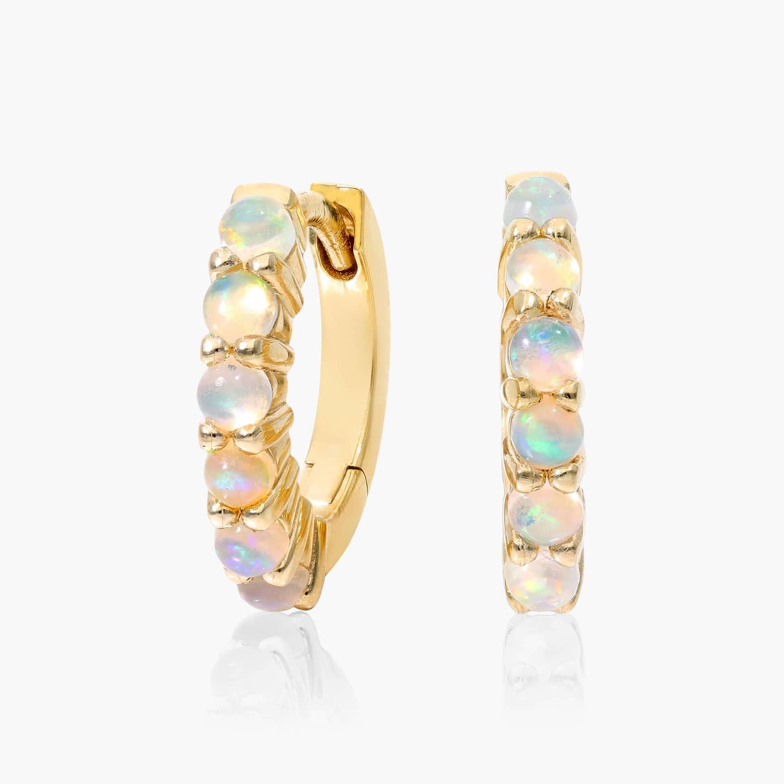 A row of petite opal cabochons are set in fine 14K yellow gold huggie hoop earrings.