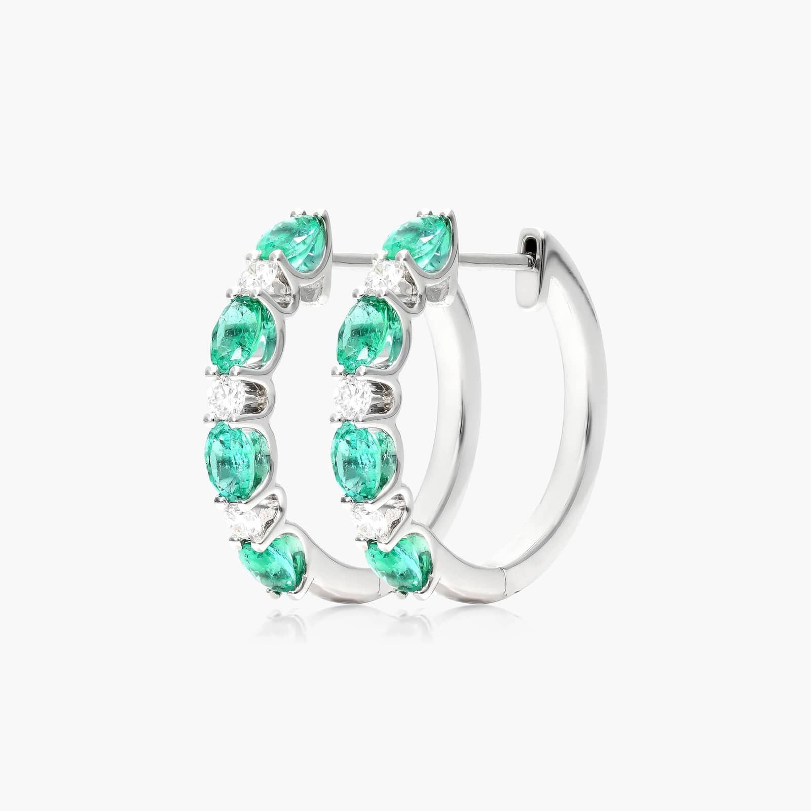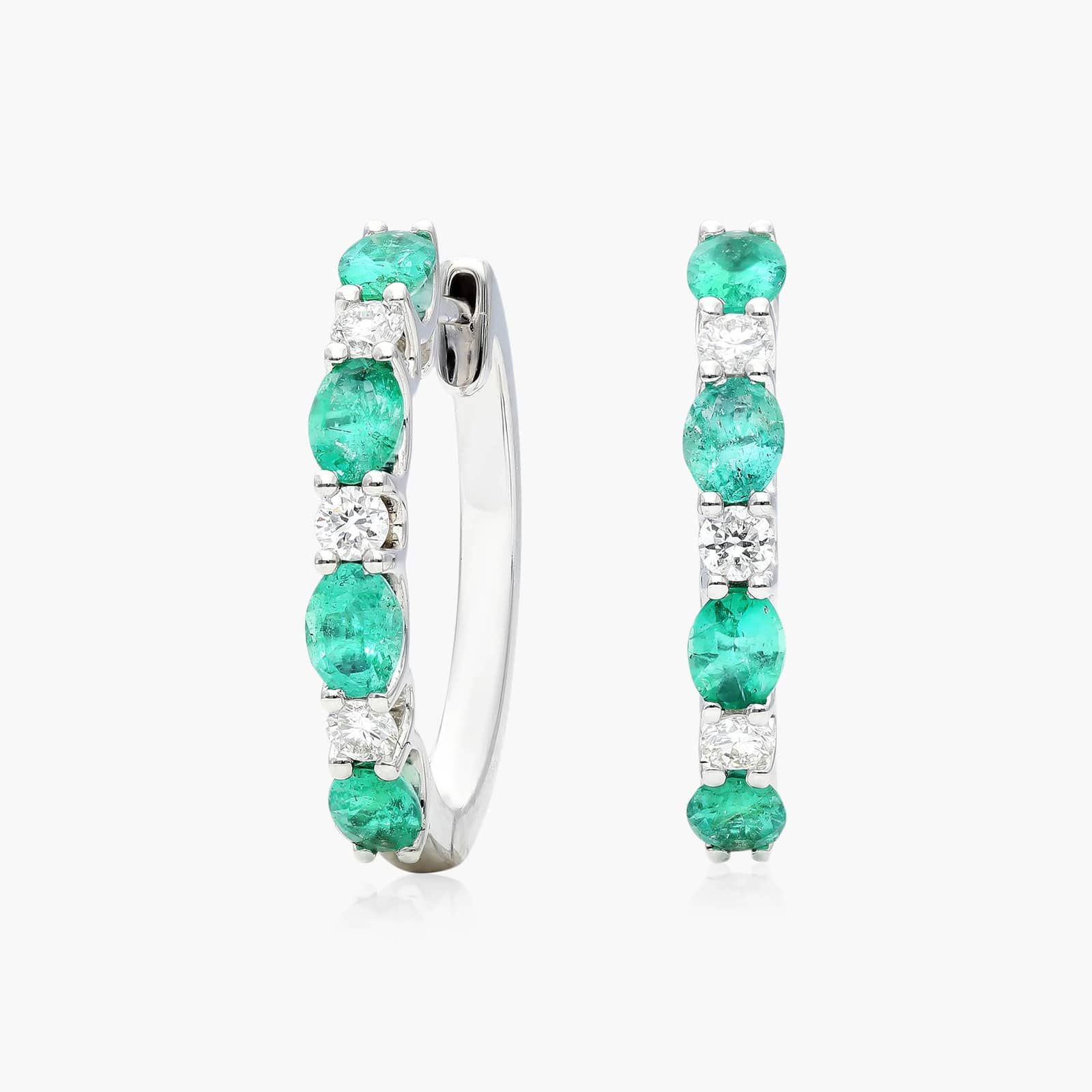 Alternating Oval Cut Emerald And Round Diamond Hoop Earrings In 14K White Gold