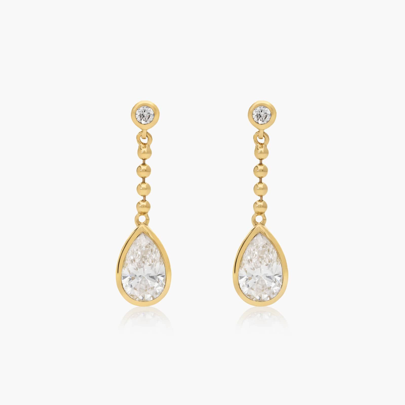 Make a statement with lab-grown diamond drop earrings. These earrings are durable and stylish with beaded chain details, bezel settings, pear shaped lab-grown diamonds, and 14k yellow gold construction.