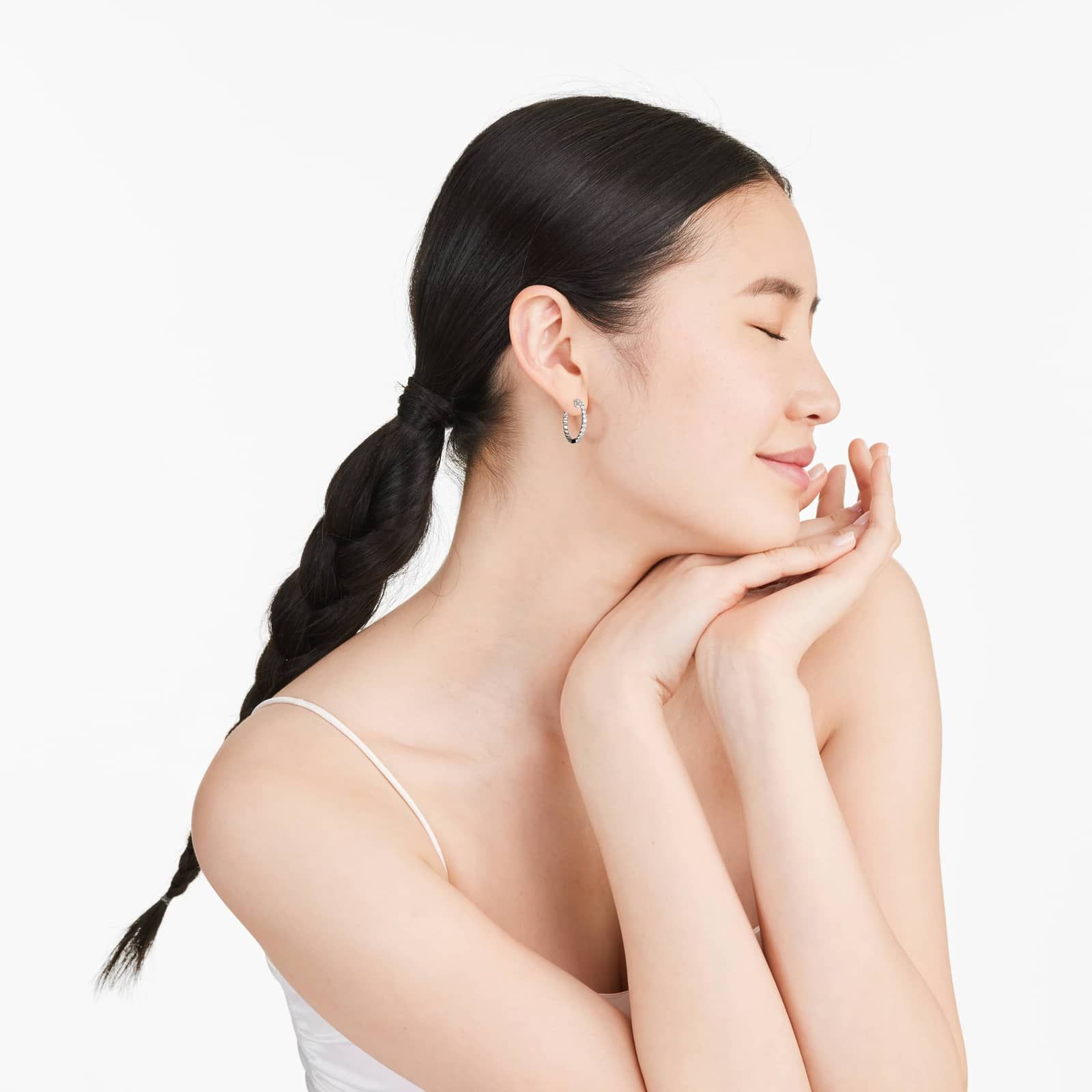 These head turning Lab-Grown diamond hoop earrings are nothing but extraordinary. Round Lab-Grown Lab-Grown diamonds in trellis settings lead the way and embellish the frontal side of the hoop while the back is adorned with a striking and intricate braid design. These exquisitely crafted hoop earrings feature a hinge mechanism and a snap back to secure the earrings closed.