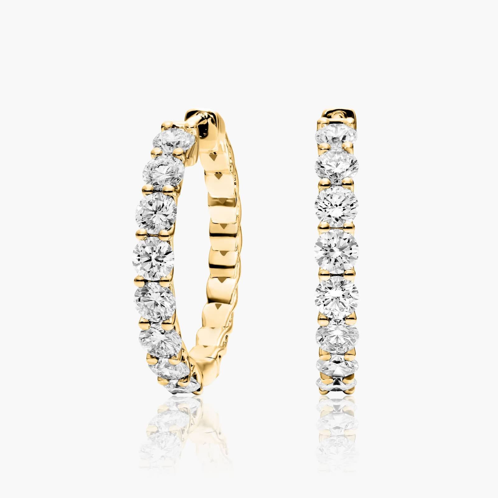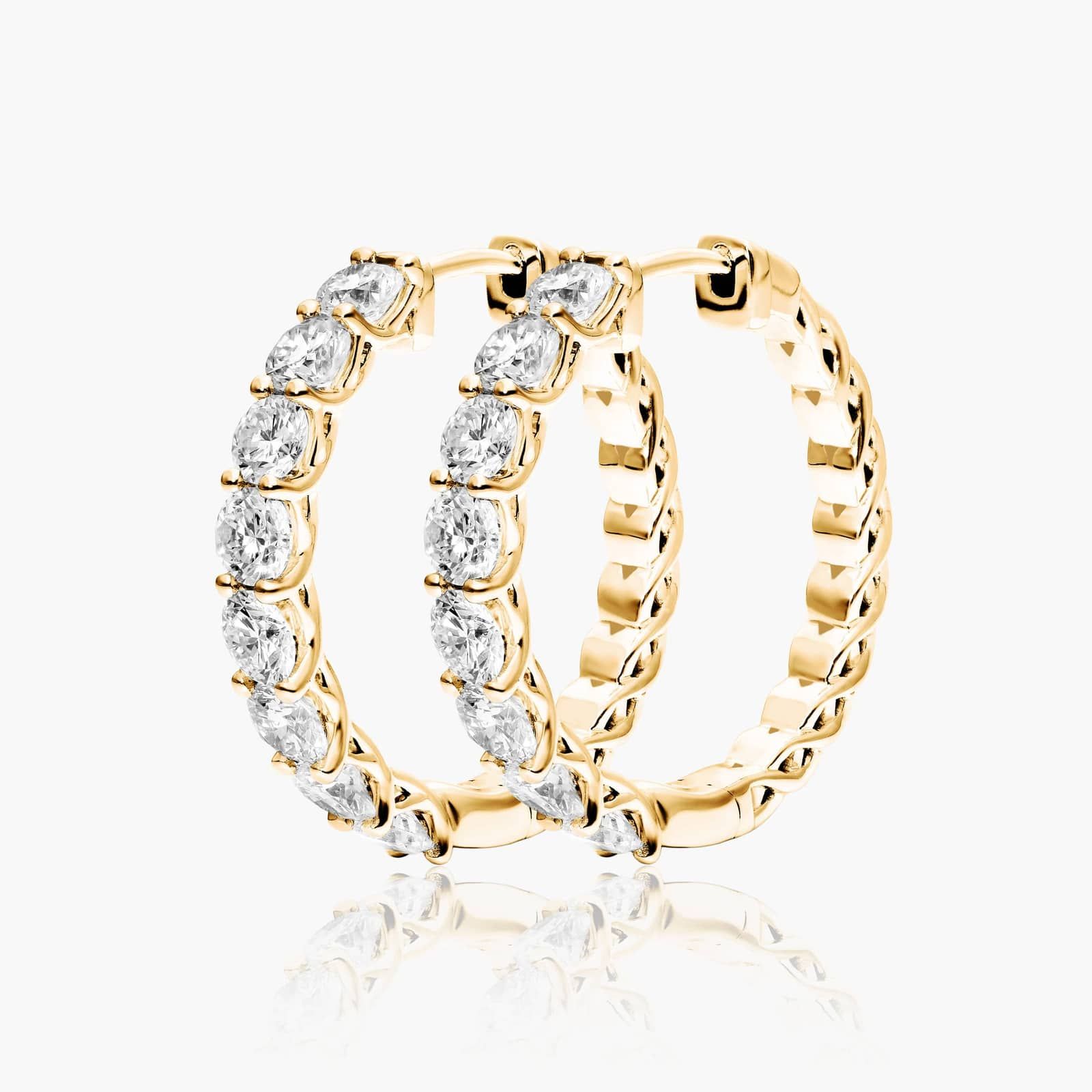 These head turning diamond hoop earrings are nothing but extraordinary. Round diamonds in trellis settings lead the way and embellish the frontal side of the hoop while the back is adorned with a striking and intricate braid design. These exquisitely crafted hoop earrings feature a hinge mechanism and a snap back to secure the earrings closed.