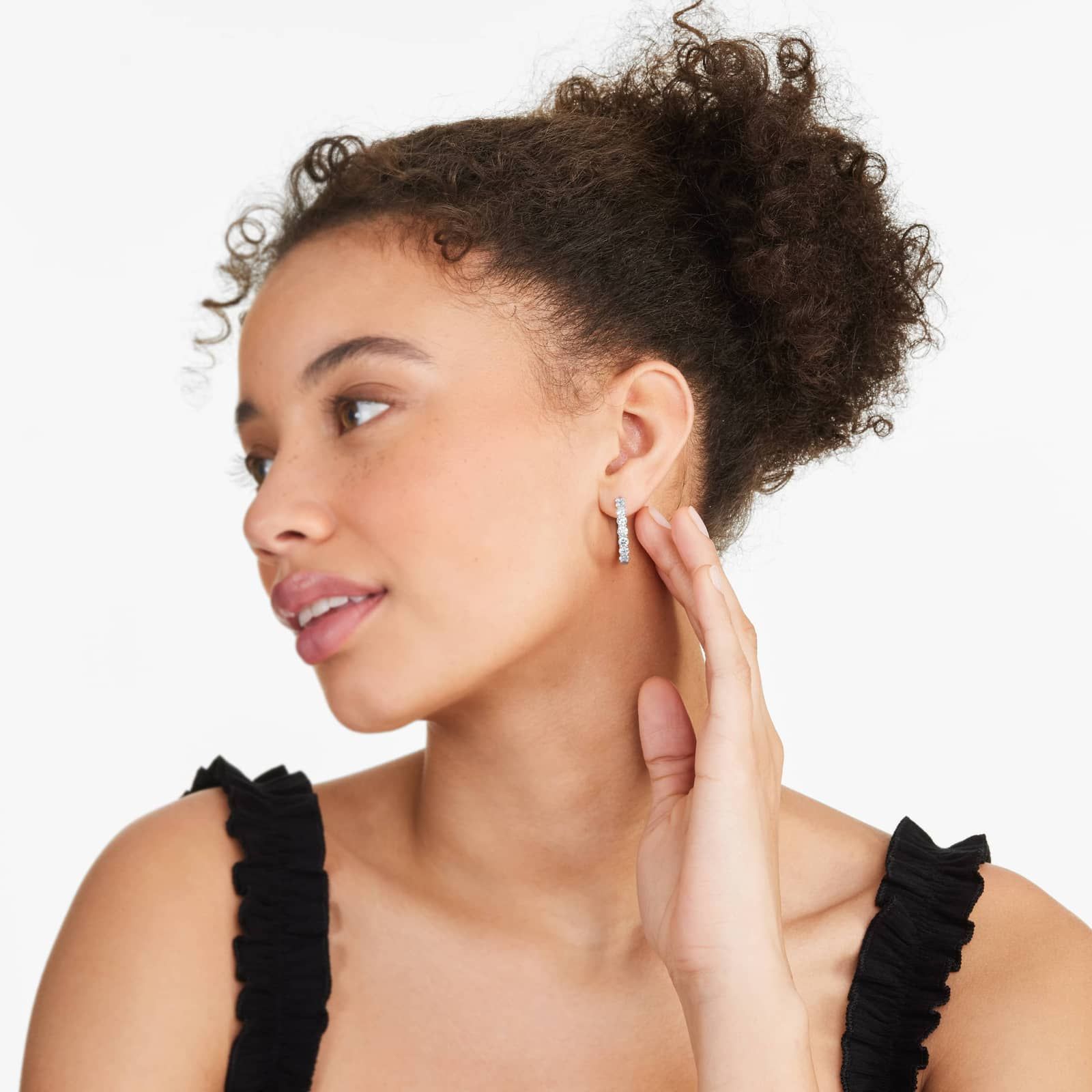 These head turning diamond hoop earrings are nothing but extraordinary. Round diamonds in trellis settings lead the way and embellish the frontal side of the hoop while the back is adorned with a striking and intricate braid design. These exquisitely crafted hoop earrings feature a hinge mechanism and a snap back to secure the earrings closed.