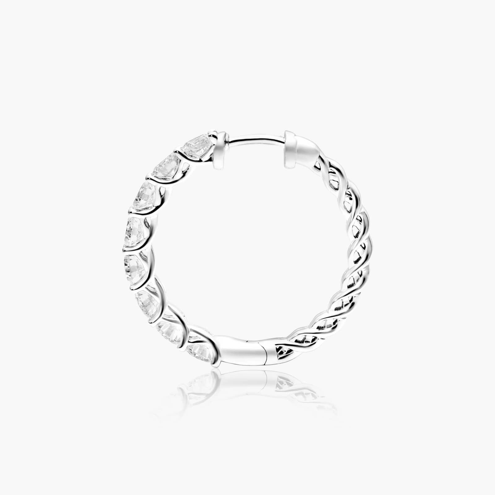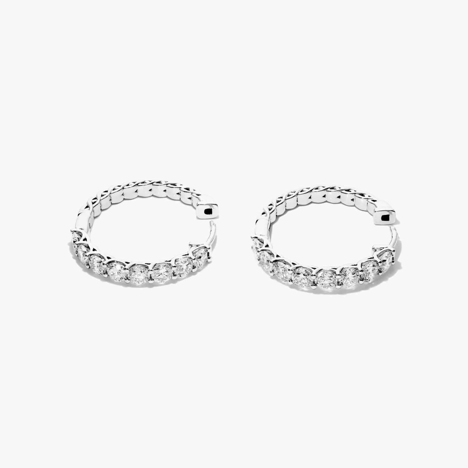 These head turning Lab-Grown diamond hoop earrings are nothing but extraordinary. Round Lab-Grown Lab-Grown diamonds in trellis settings lead the way and embellish the frontal side of the hoop while the back is adorned with a striking and intricate braid design. These exquisitely crafted hoop earrings feature a hinge mechanism and a snap back to secure the earrings closed.