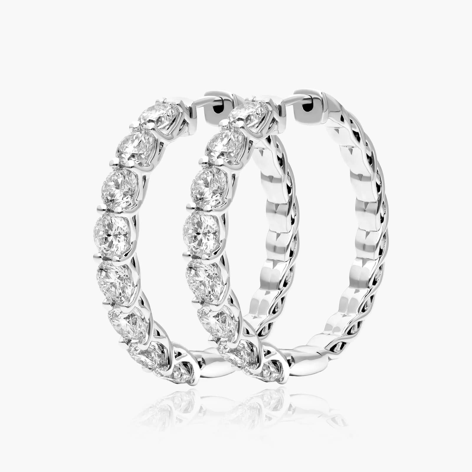 These head turning diamond hoop earrings are nothing but extraordinary. Round diamonds in trellis settings lead the way and embellish the frontal side of the hoop while the back is adorned with a striking and intricate braid design. These exquisitely crafted hoop earrings feature a hinge mechanism and a snap back to secure the earrings closed.