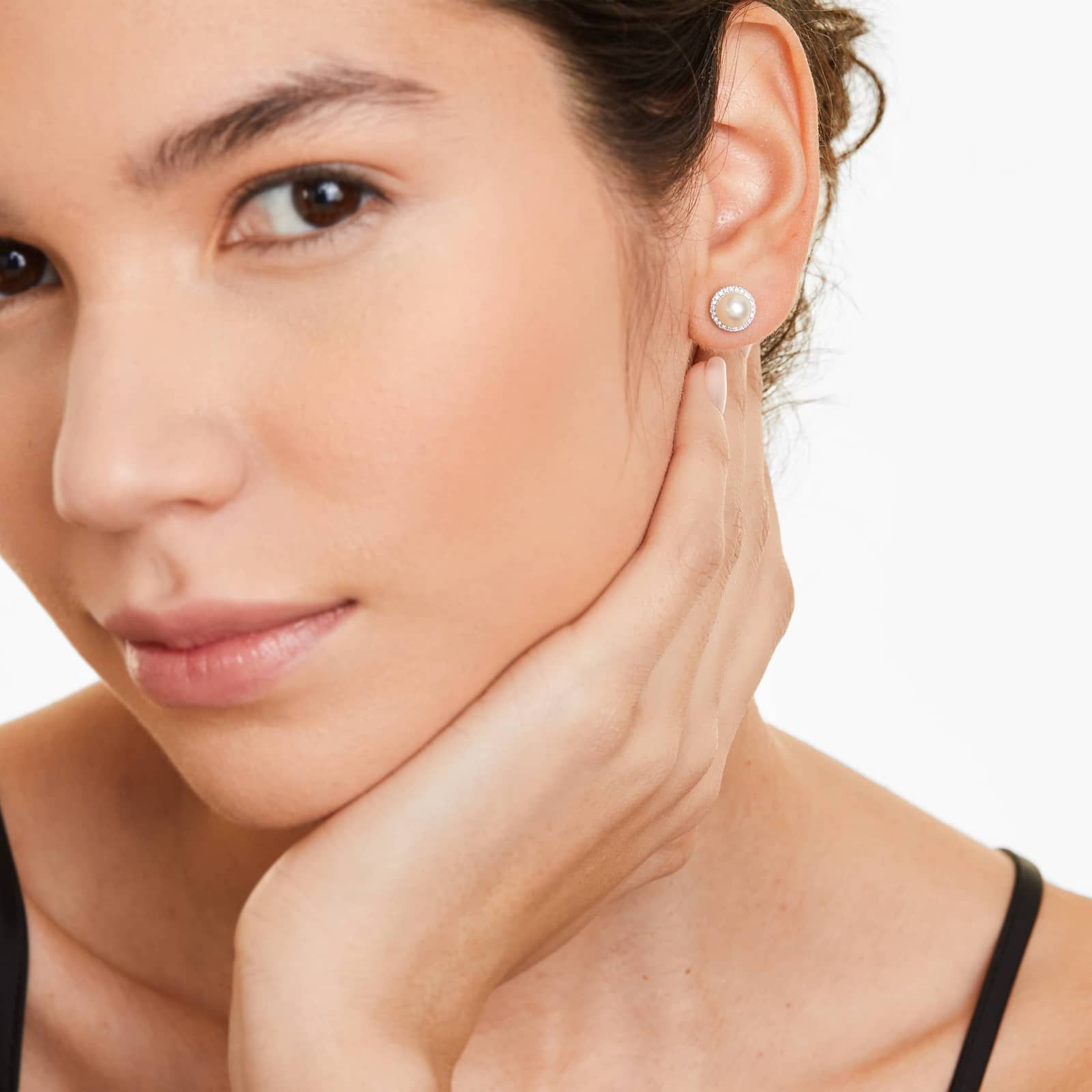 Lustrous cultured freshwater pearls are surrounded by an elegant diamond halo.