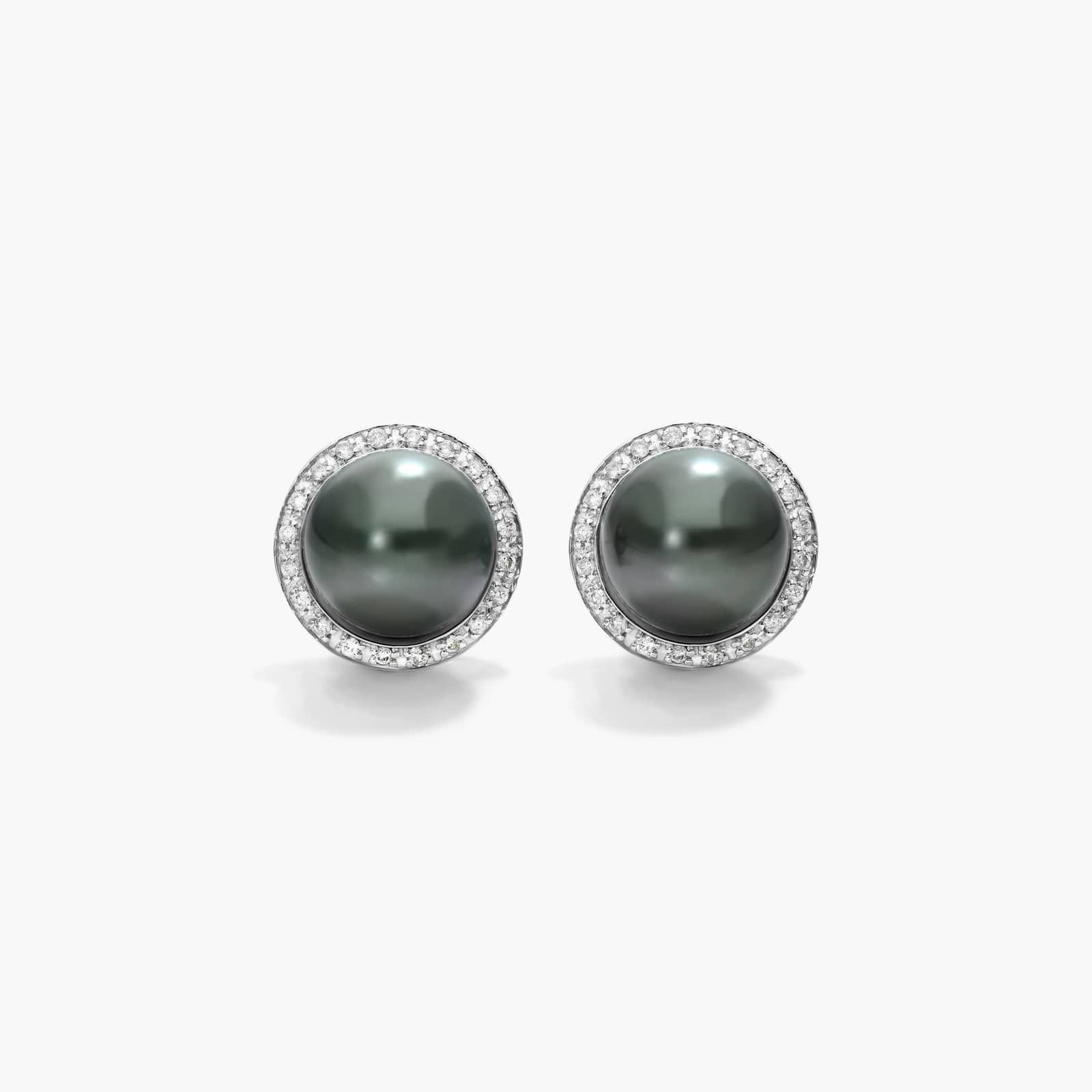 This pair of 8.0 to 9.0 mm Tahitian pearls is surrounded by a halo of round brilliant diamonds. This timeless look is sophisticated and luxurious.