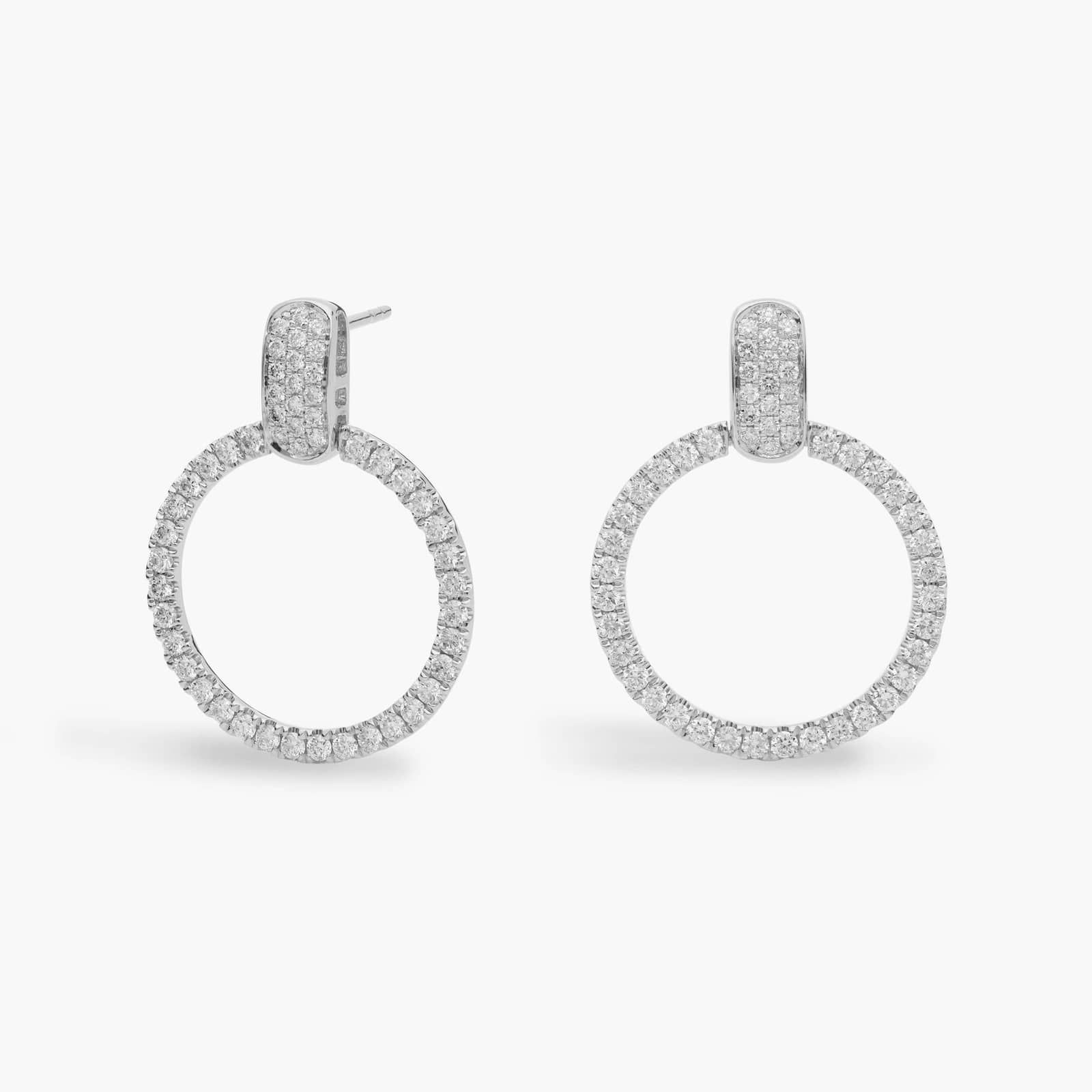 Catch the light with these stunning drop earrings featuring diamonds shimmering beautifully along the circle-shaped design. The 14k white gold setting beautifully complements the stones with a cool, luxurious gleam.