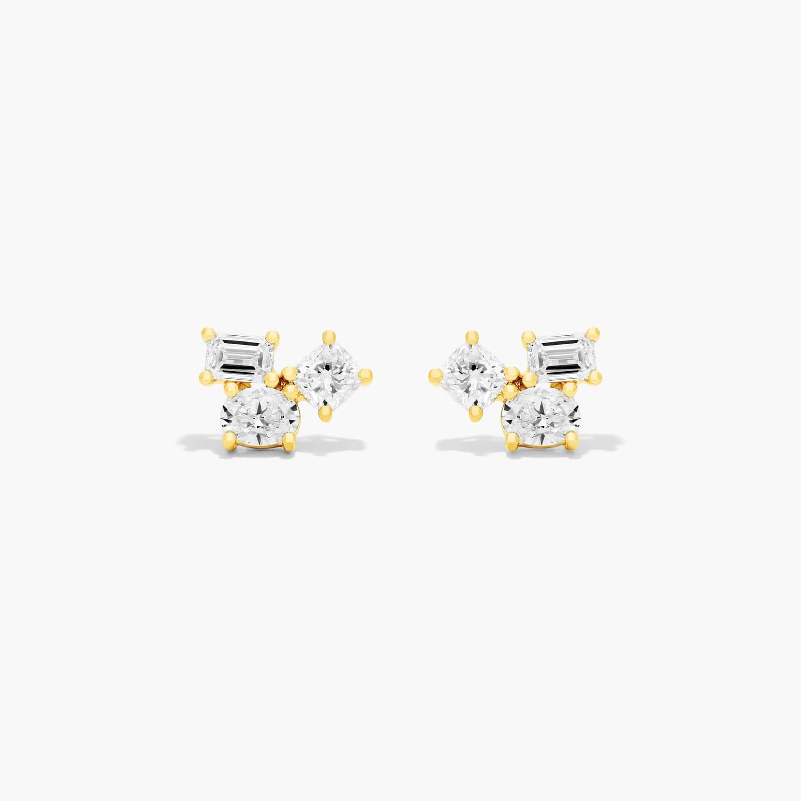 These earrings feature cushion cut, emerald, and oval shaped Lab-Grown diamonds and finish with a push back closure. These stylish studs can be worn every day!