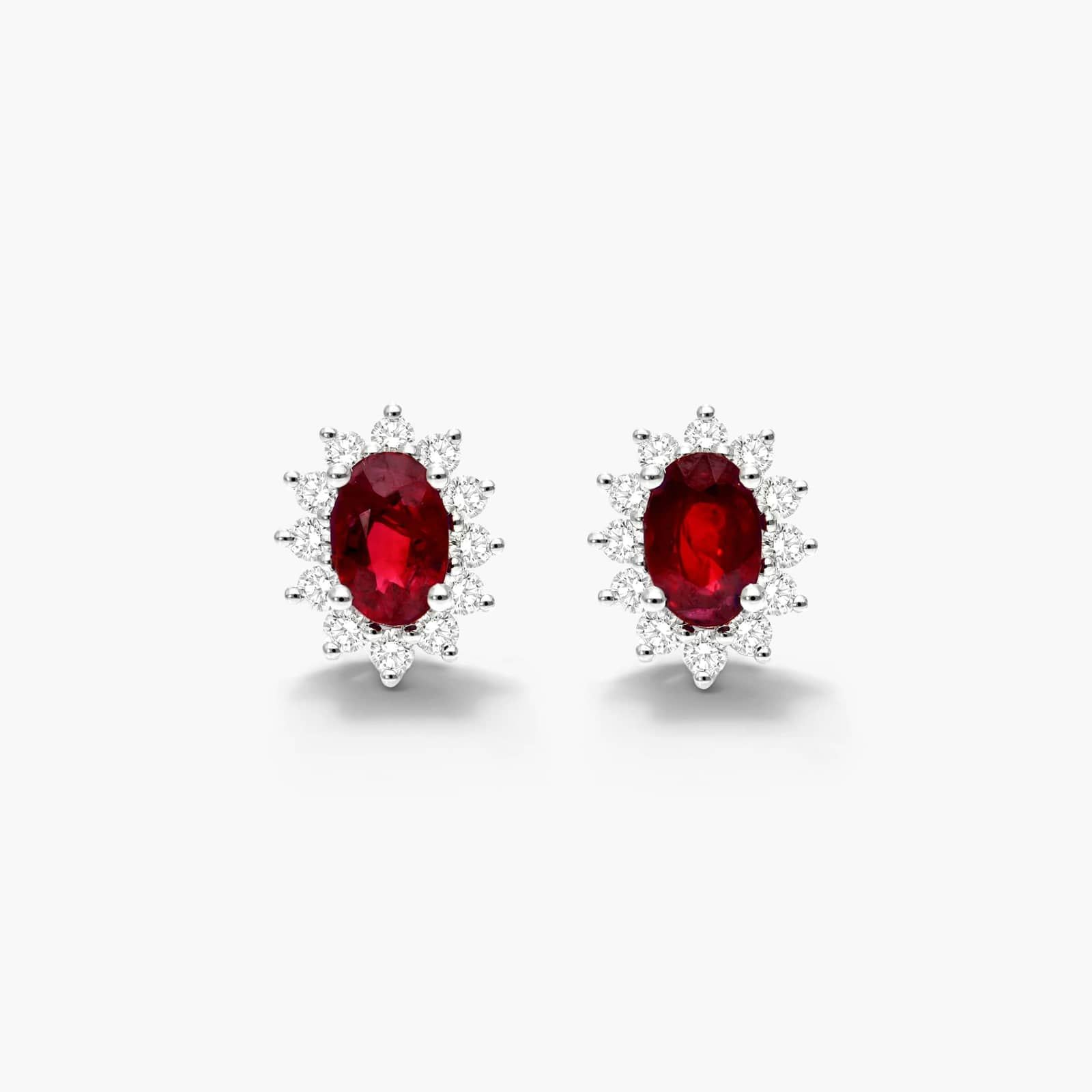 Celebrate a classic look with these stud earrings featuring oval rubies surrounded by halos of glistening diamonds. The unique prong setting of the diamond halo lends a vintage feel to this chic pair of earrings that will instantly upgrade any look.