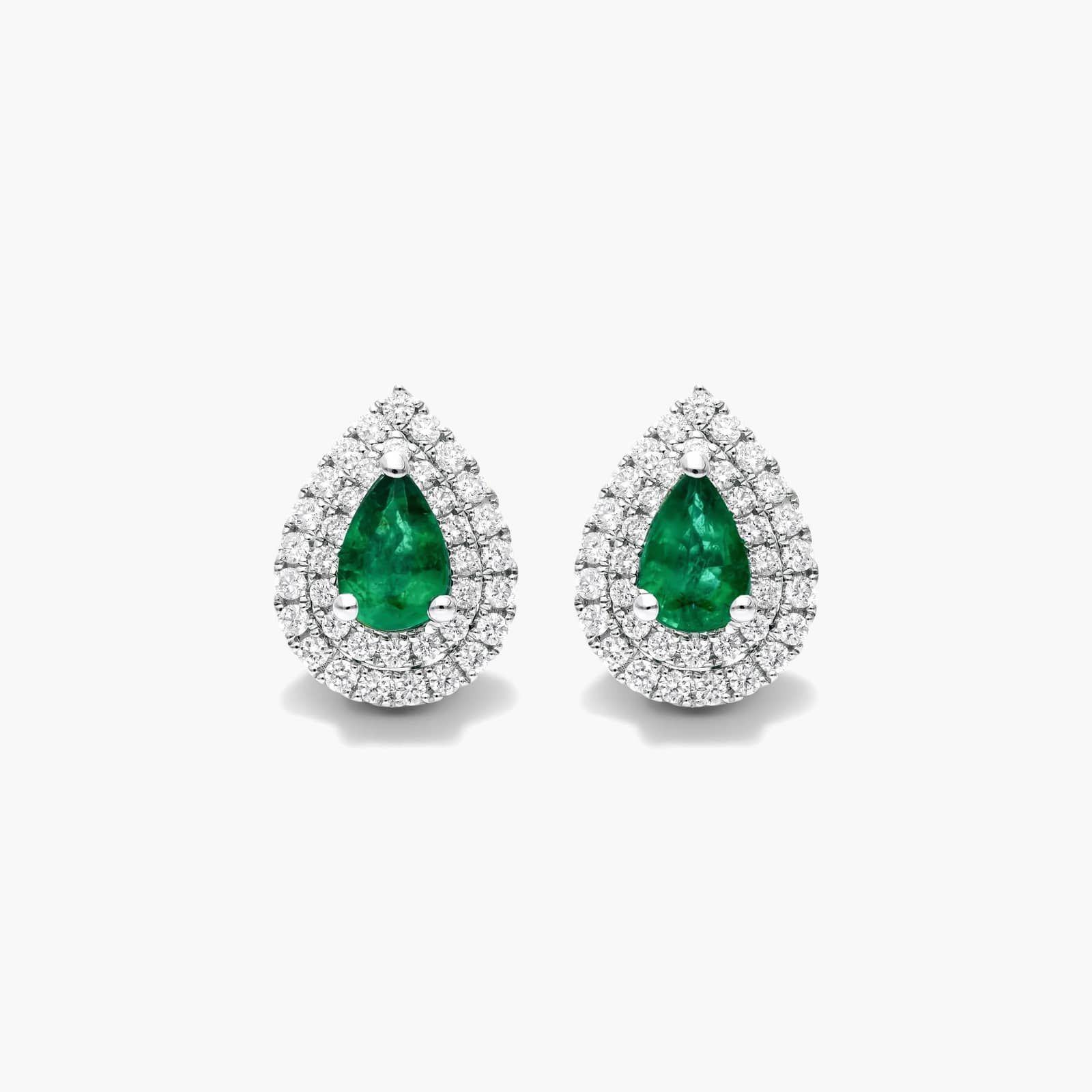 These luxurious earrings feature pear shaped emeralds as center stones surrounded by a striking double diamond halo to add brilliance and the ultimate wow factor. Pushbacks secure the earrings in place.