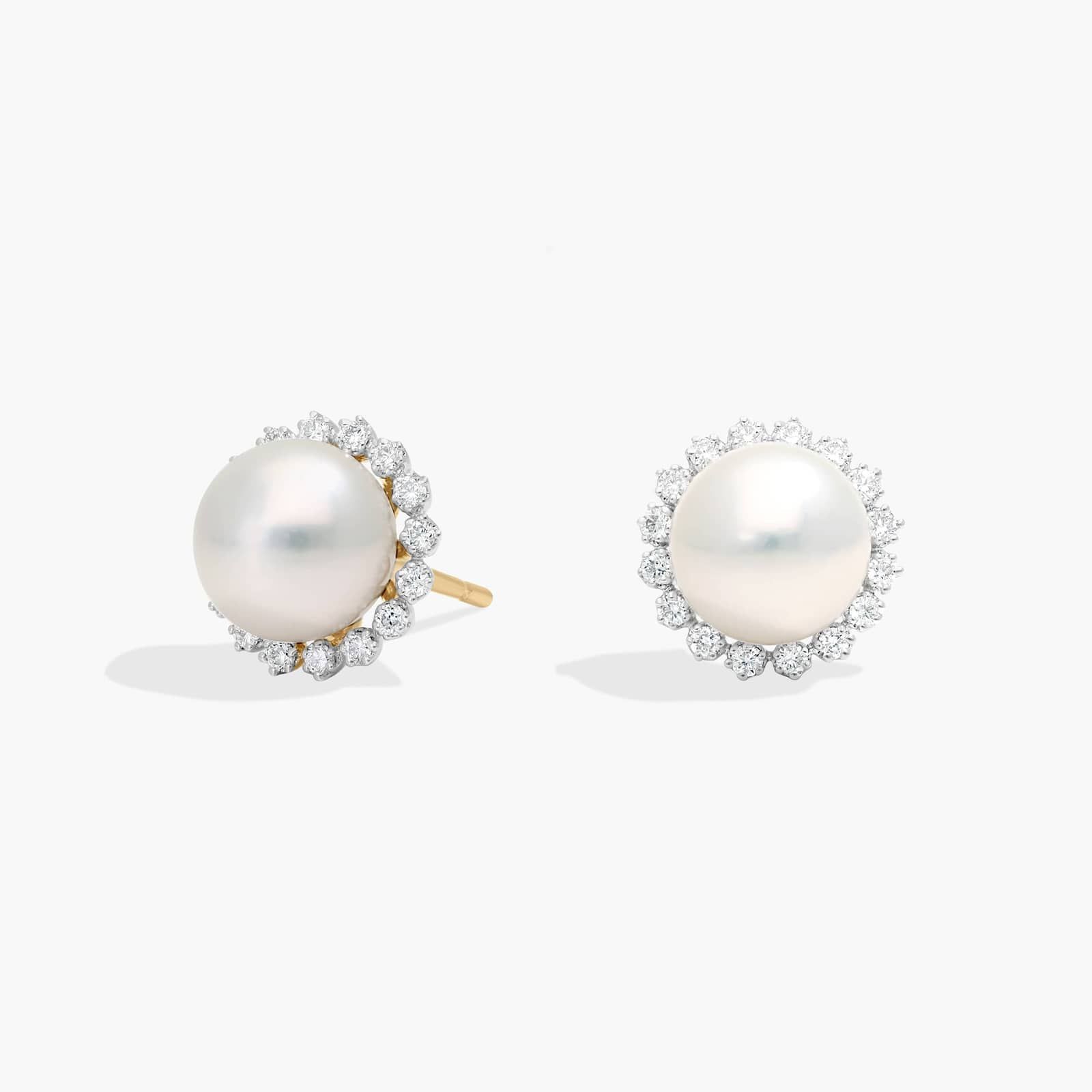 Pearl and Diamond Halo Stud Earrings in 14K Yellow Gold