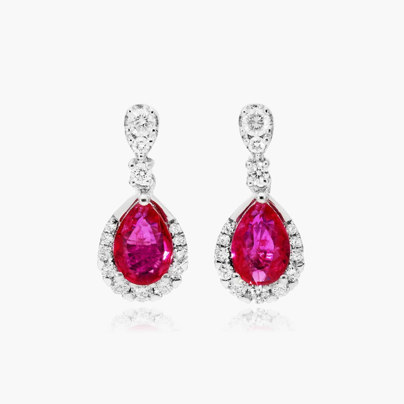 An elegant and classic piece that will be passed down through generations. These vibrant ruby and diamond drop shaped earrings will elevate your evening look.