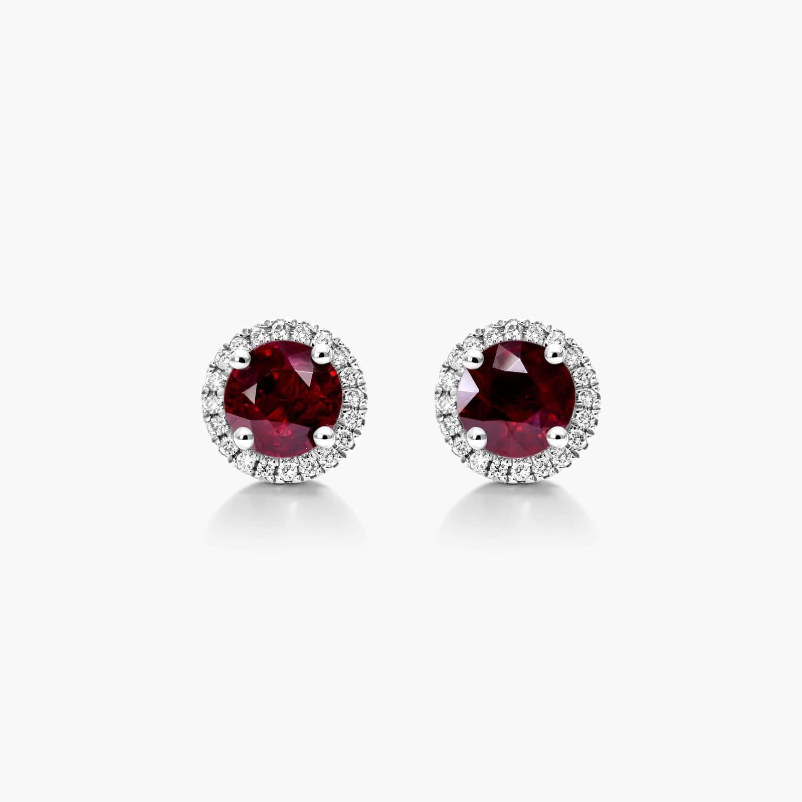 Celebrate a classic look with these ruby studs surrounded by a halo of glistening diamonds. This chic pair of earrings will instantly upgrade any look.