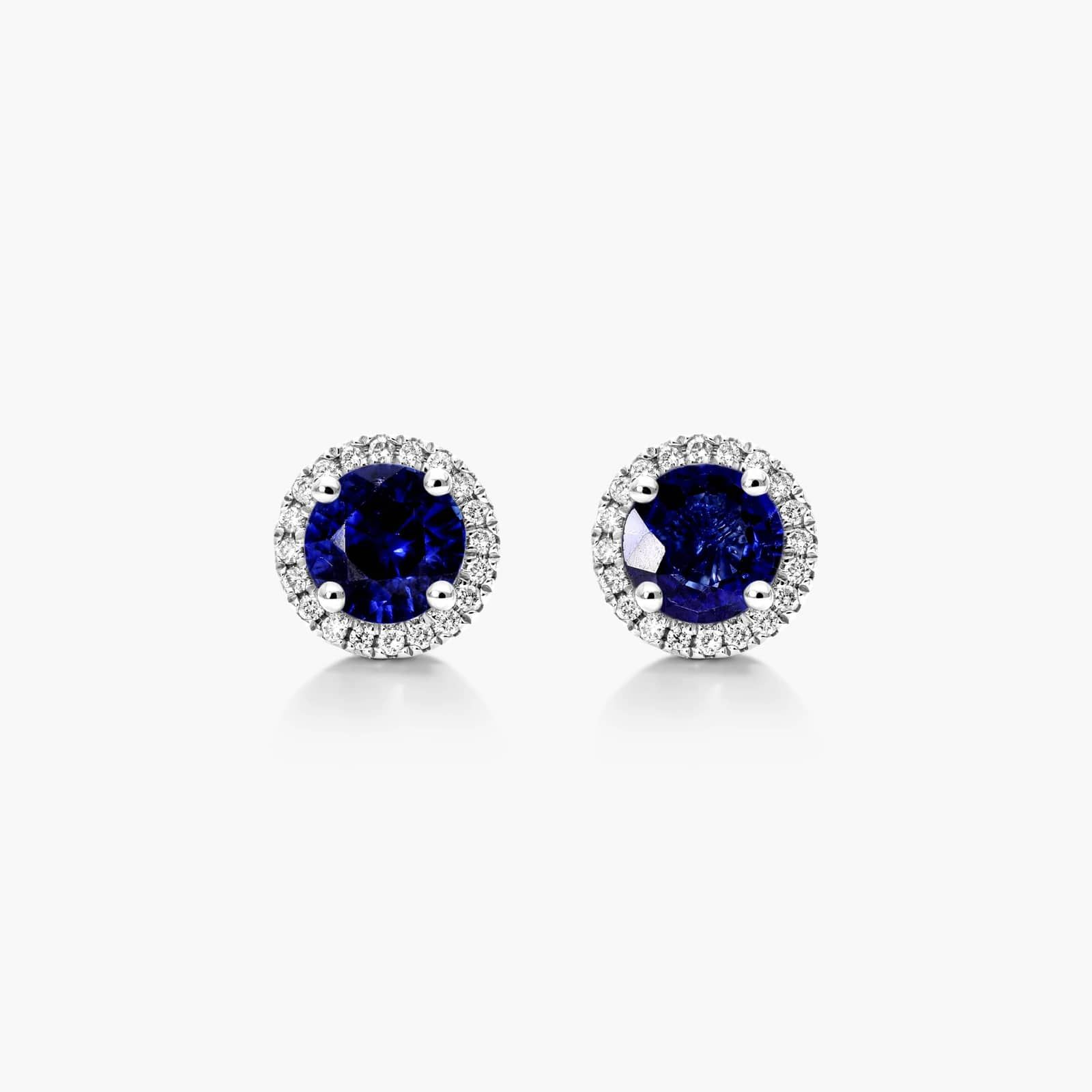 Celebrate a classic look with these sapphire studs surrounded by a halo of glistening diamonds. This chic pair of earrings will instantly upgrade any look.