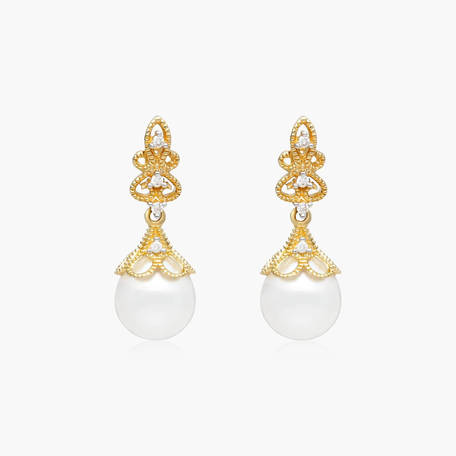 These vintage inspired 9.0-9.5mm drop earrings are a gorgeous way to bring in the regal feel of freshwater pearls with an elaborate, vintage setting. The filligree-like design is dotted with diamonds to give this pair the appeal and sophistication of vintage glamour.