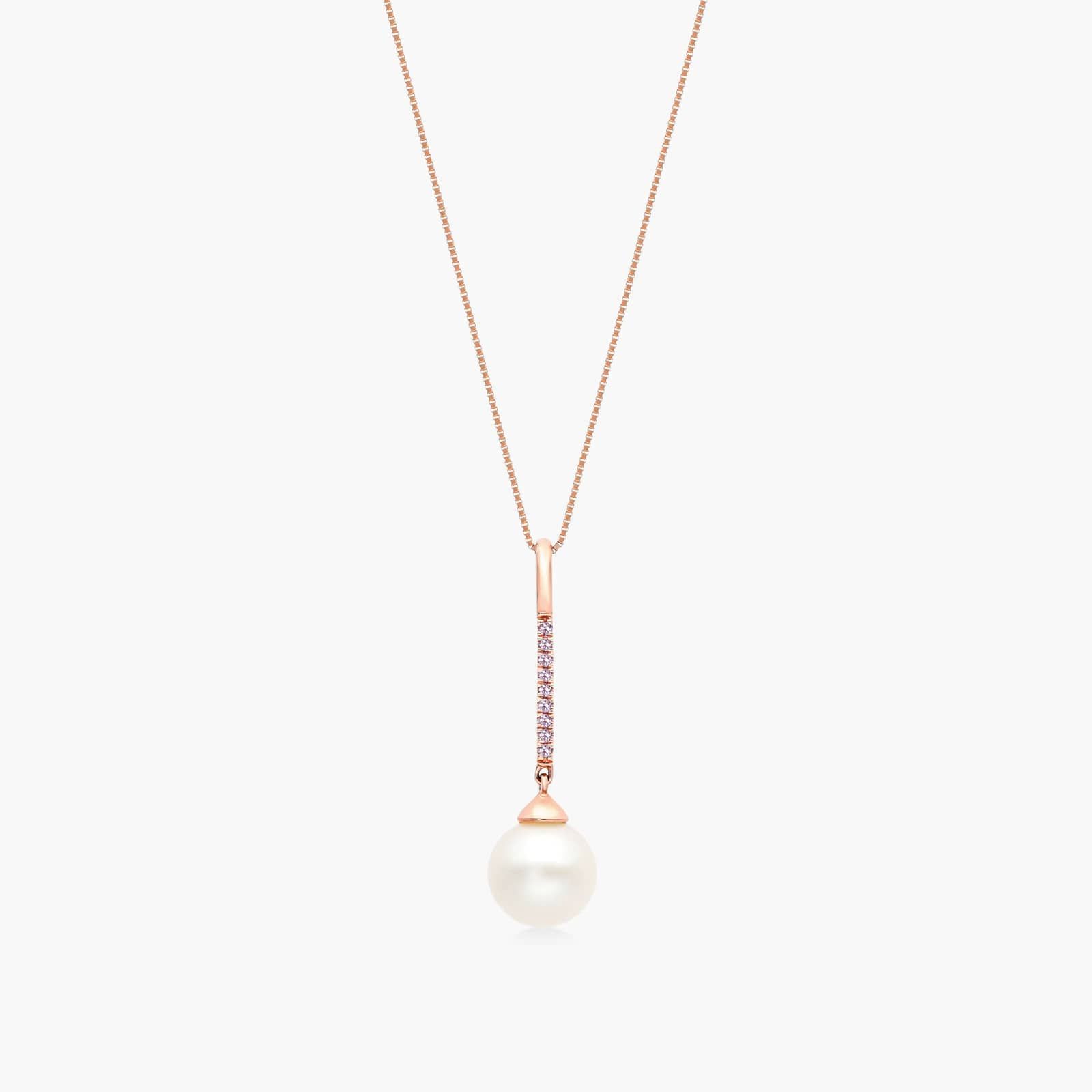 A delicate 14K rose gold bar lined with brilliant amethysts is the perfect complement to a 8.0-8.5mm freshwater pearl drop pendant. This look is a glamorous take on minimalist luxury.