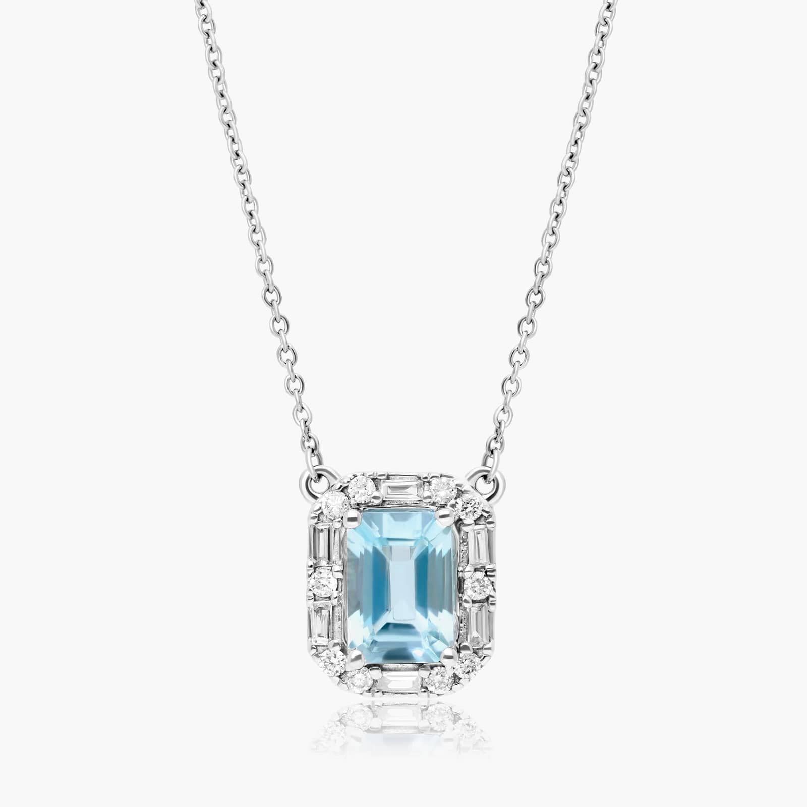 This is the piece your jewelry box has been missing. The calming blue of aquamarine is surrounded by perfectly sparkling diamonds in a halo setting. This necklace is crafted in bright, white gold, to create a look that will shine on any occasion.