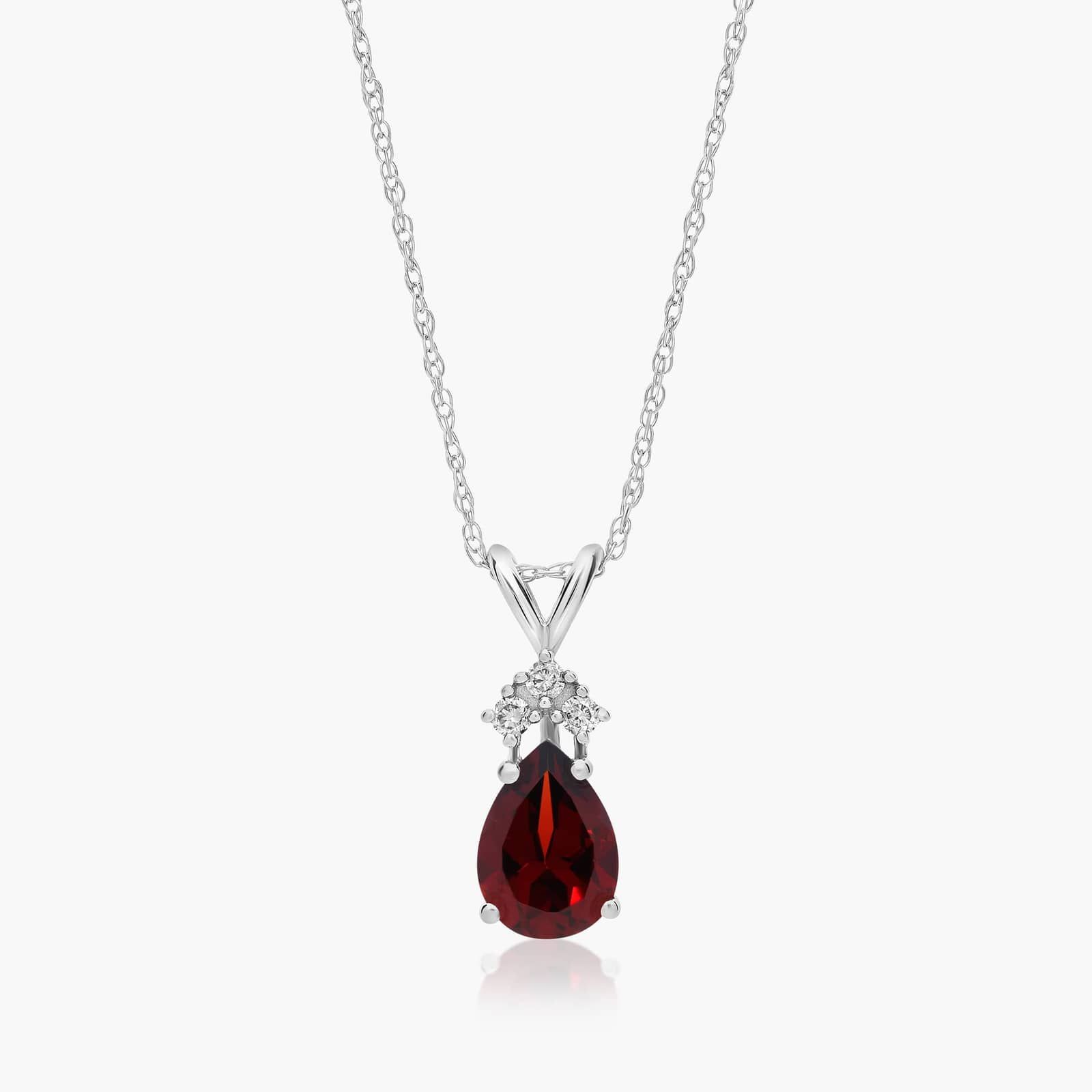 14K White Gold Pear Shaped Garnet & Tri-Diamond Birthstone Pendant Necklace