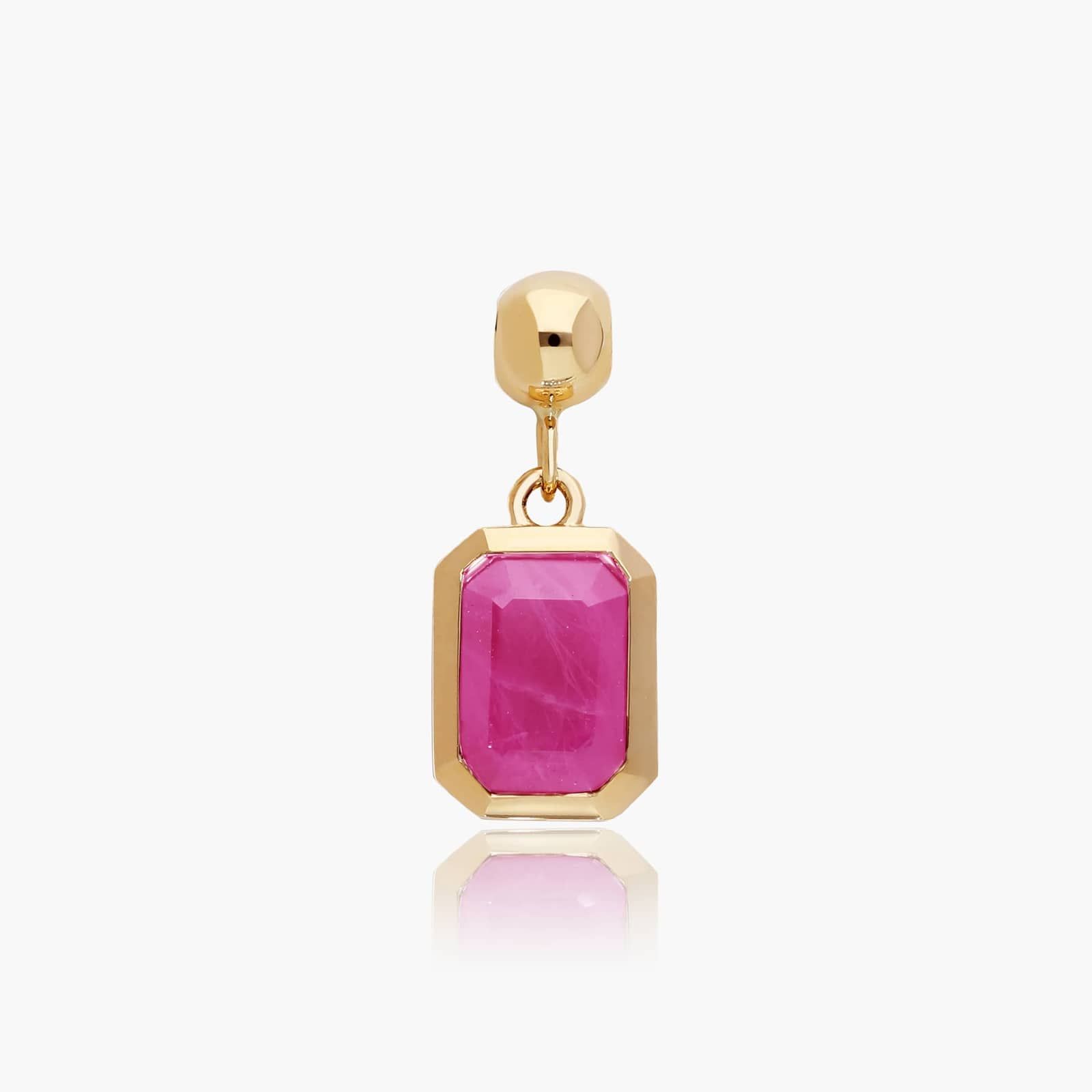 July's birthstone is cut in a strong emerald shape and set in a protective bezel setting to create a collectible charm perfect for marking all your meaningful moments. Featuring its rich red color, this 14K Yellow Gold Emerald Cut Bezel Set Ruby Birthstone Charm looks great on its own, as well as layered. Get one for yourself and all your friends - because everyone's going to want one. Chain sold separately. Charms fit only on James Allen's Silicone Bead Slider Charm Chain