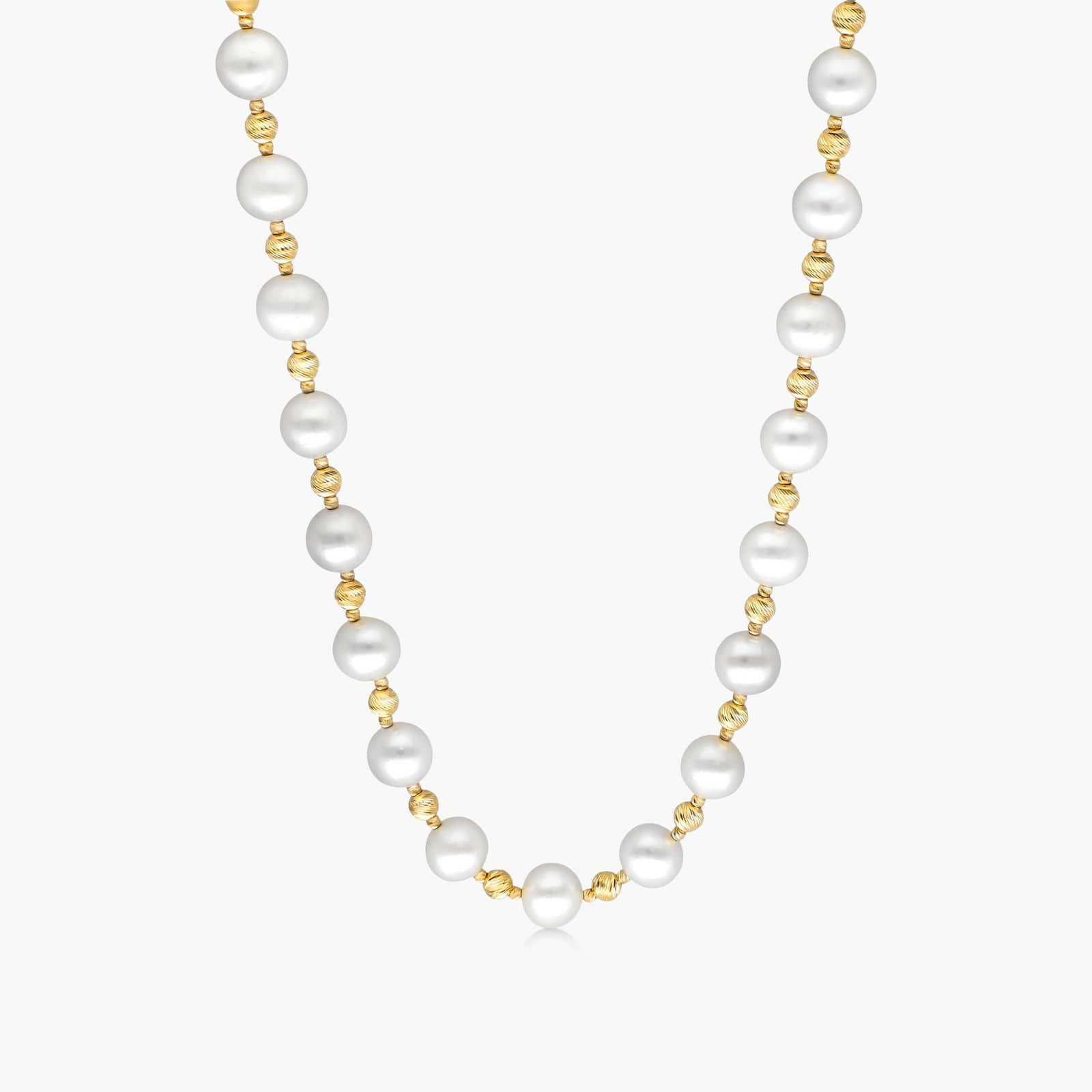 Achieve an effortlessly chic and glamorous look with this fresh take on a jewelry classic, with textured 14K yellow gold brilliance beads lying between each 7.5-8.0mm freshwater pearl, bringing out their natural lustre in this necklace. *Number of pearls may vary according to the mm size range of the pearl