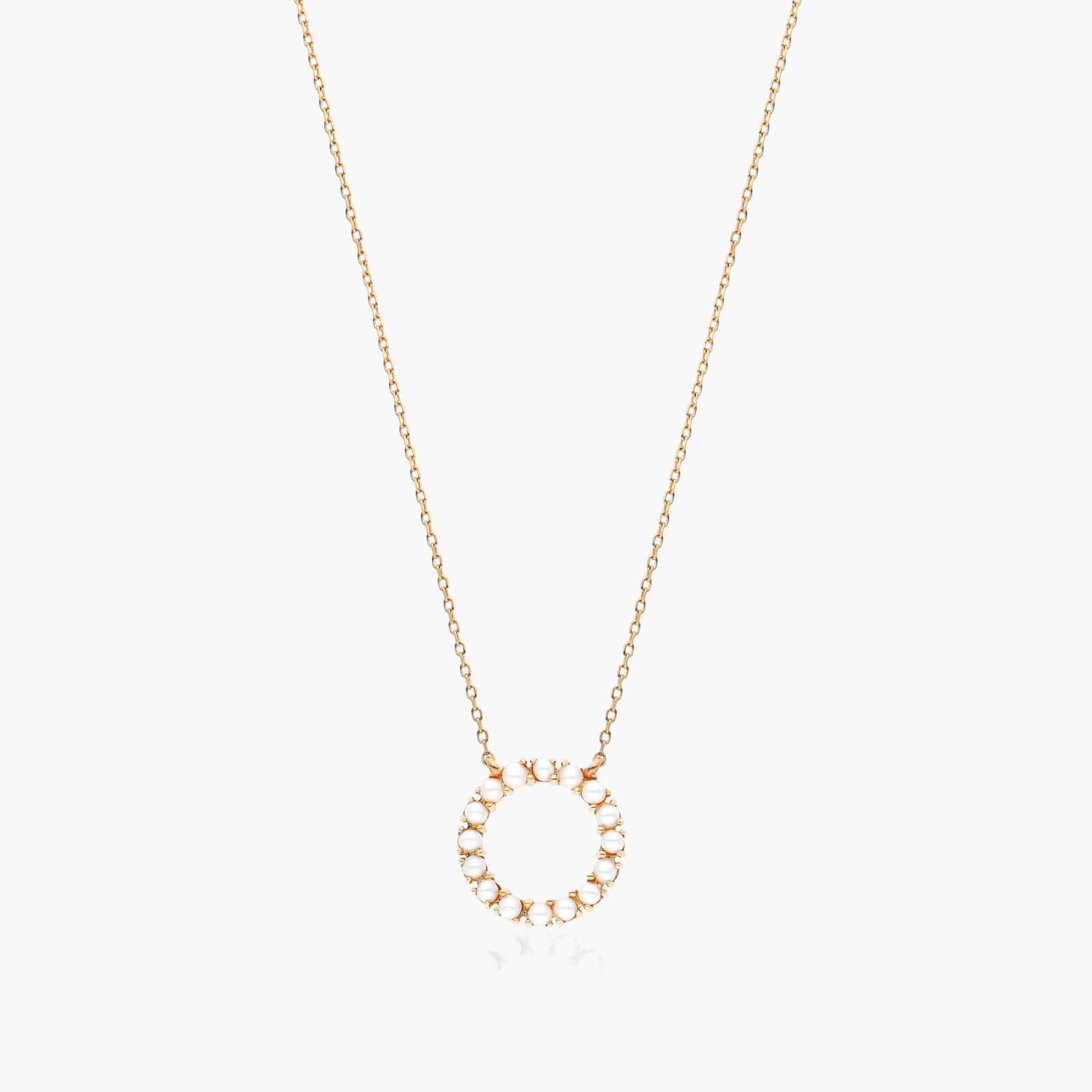 A halo of 2.0mm seed pearls set on 14K yellow gold form the centerpiece of this delicate necklace. A perfect fit for those looking for contemporary designs in a luxurious finish.