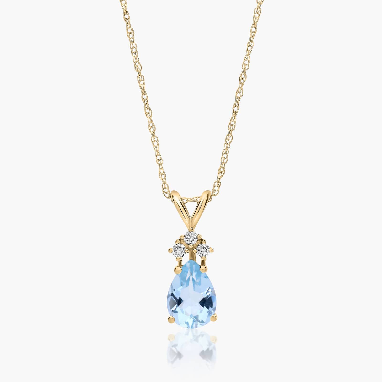 14K Yellow Gold Pear Shaped Aquamarine & Tri-Diamond Birthstone Pendant Necklace