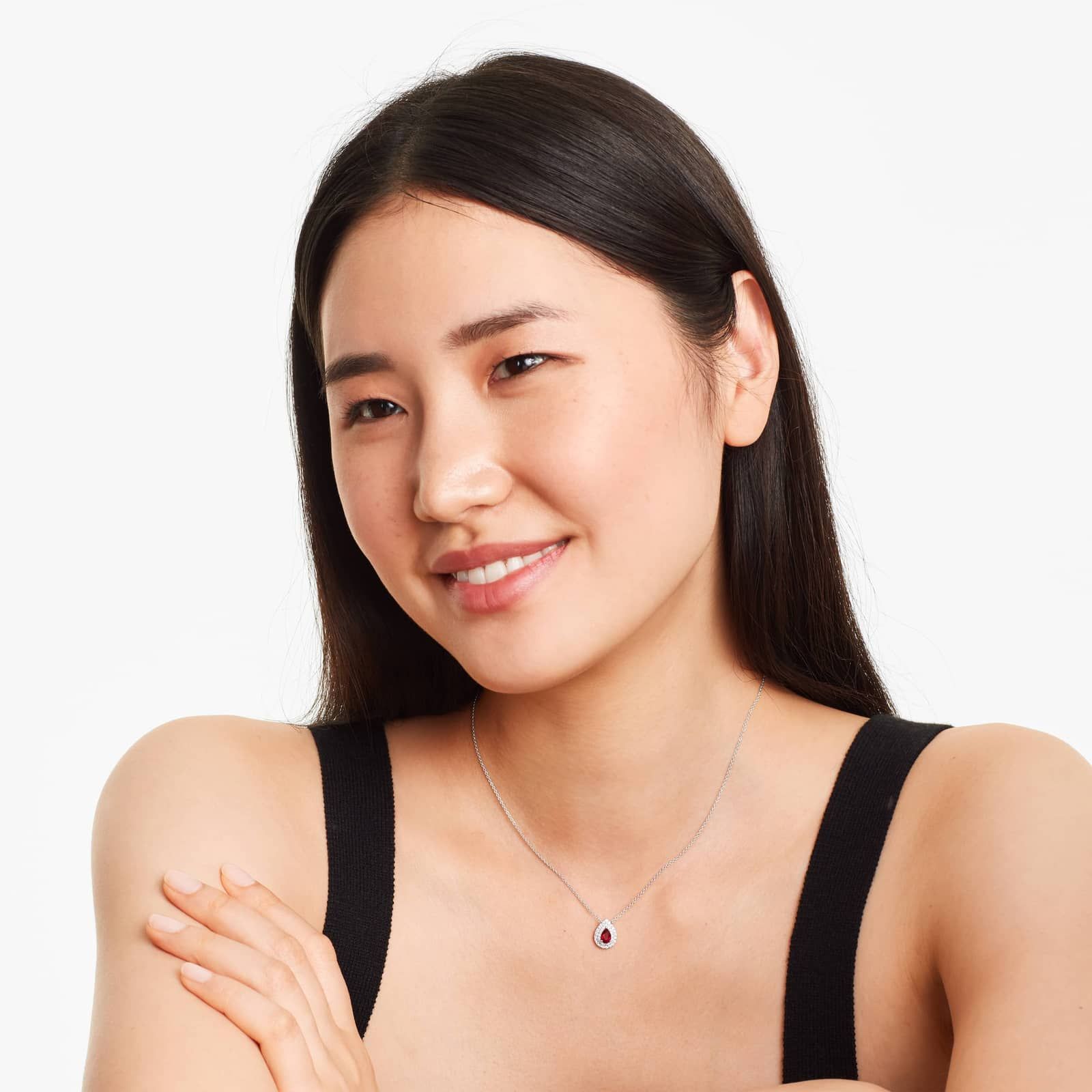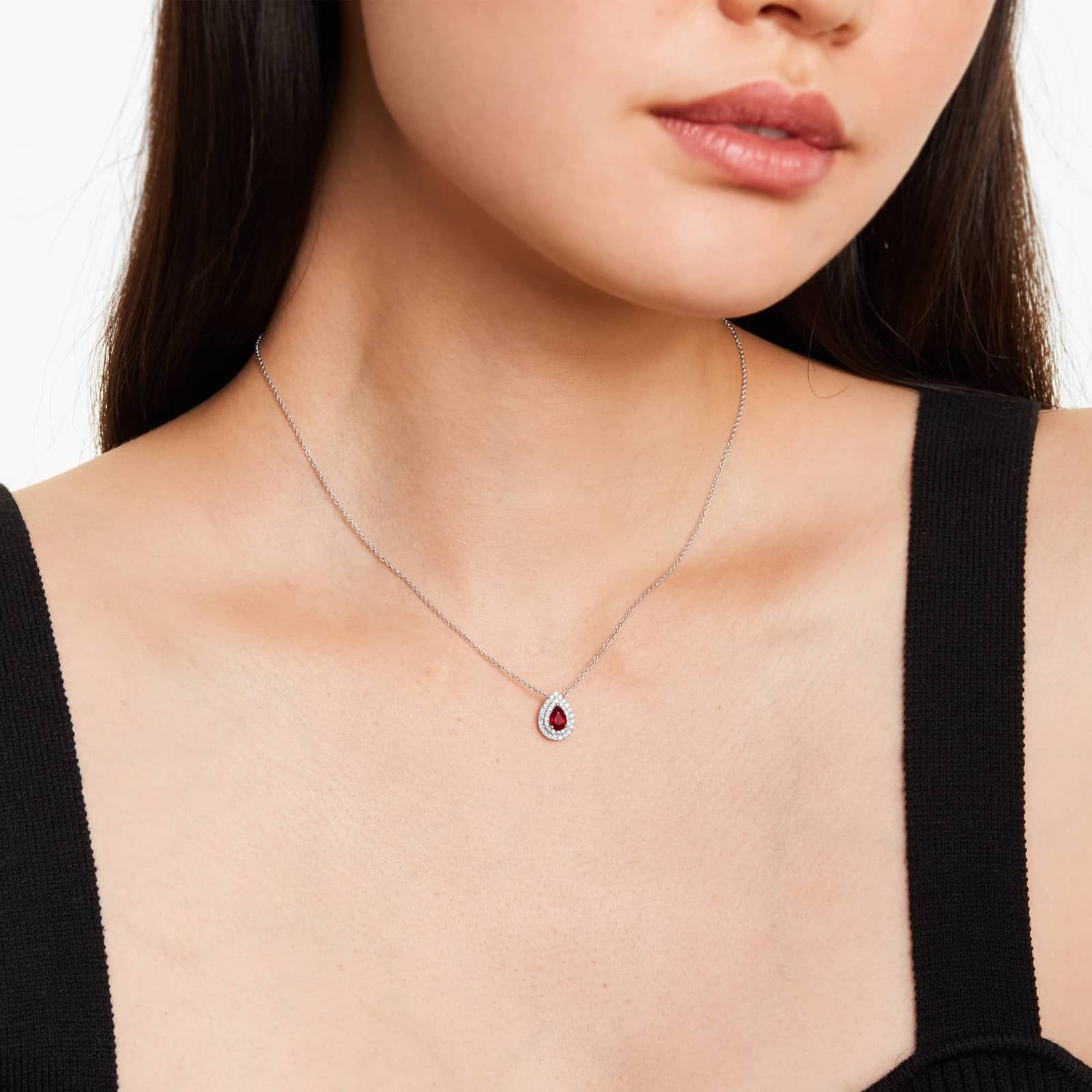 18K White Gold Pear Shape Ruby Double Diamond Halo Necklace