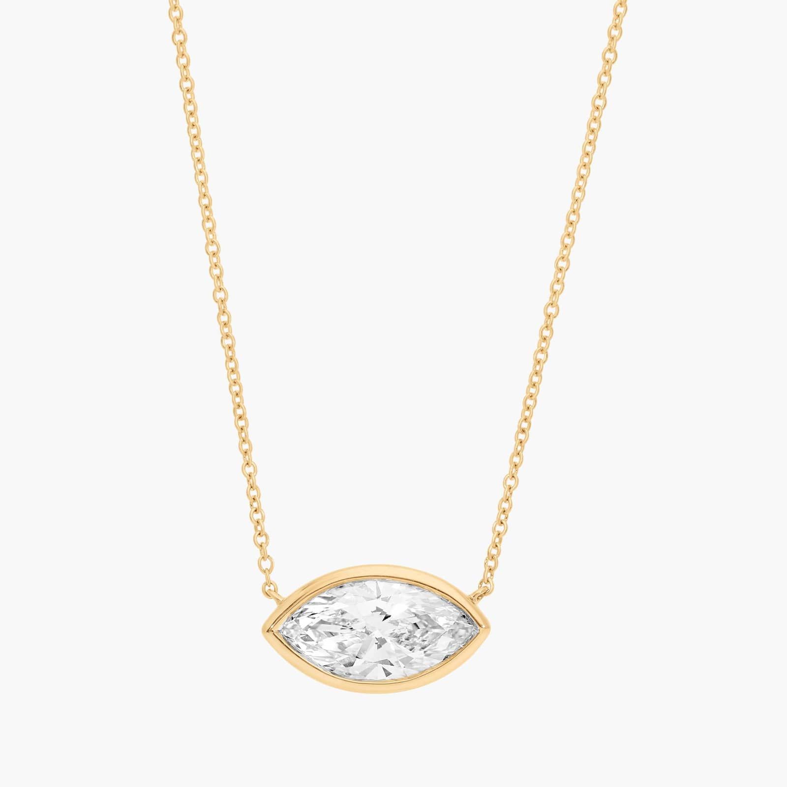 Wear an updated take on classic style with this marquise cut east-west bezel lab-grown diamond solitaire pendant. With 14k yellow gold design and bezel details, it's perfect for solo styling or necklace layering.