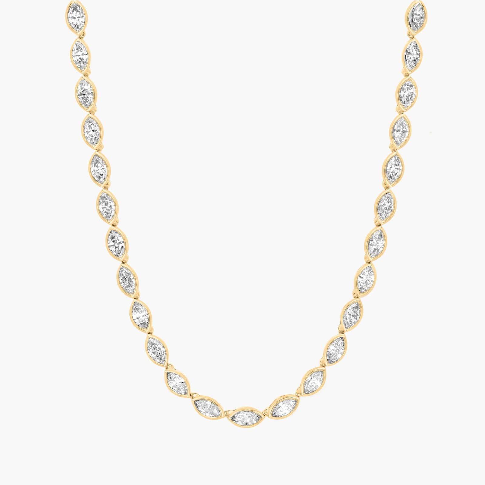 Tennis necklaces are endlessly brilliant and easy to accessorize. This east-west marquise cut lab-grown diamond tennis necklace features 14k yellow gold details and bezel settings for classic style. Wear it as a signature solo piece or as the focal point in a necklace stack. It's also a leading gift for any occasion.