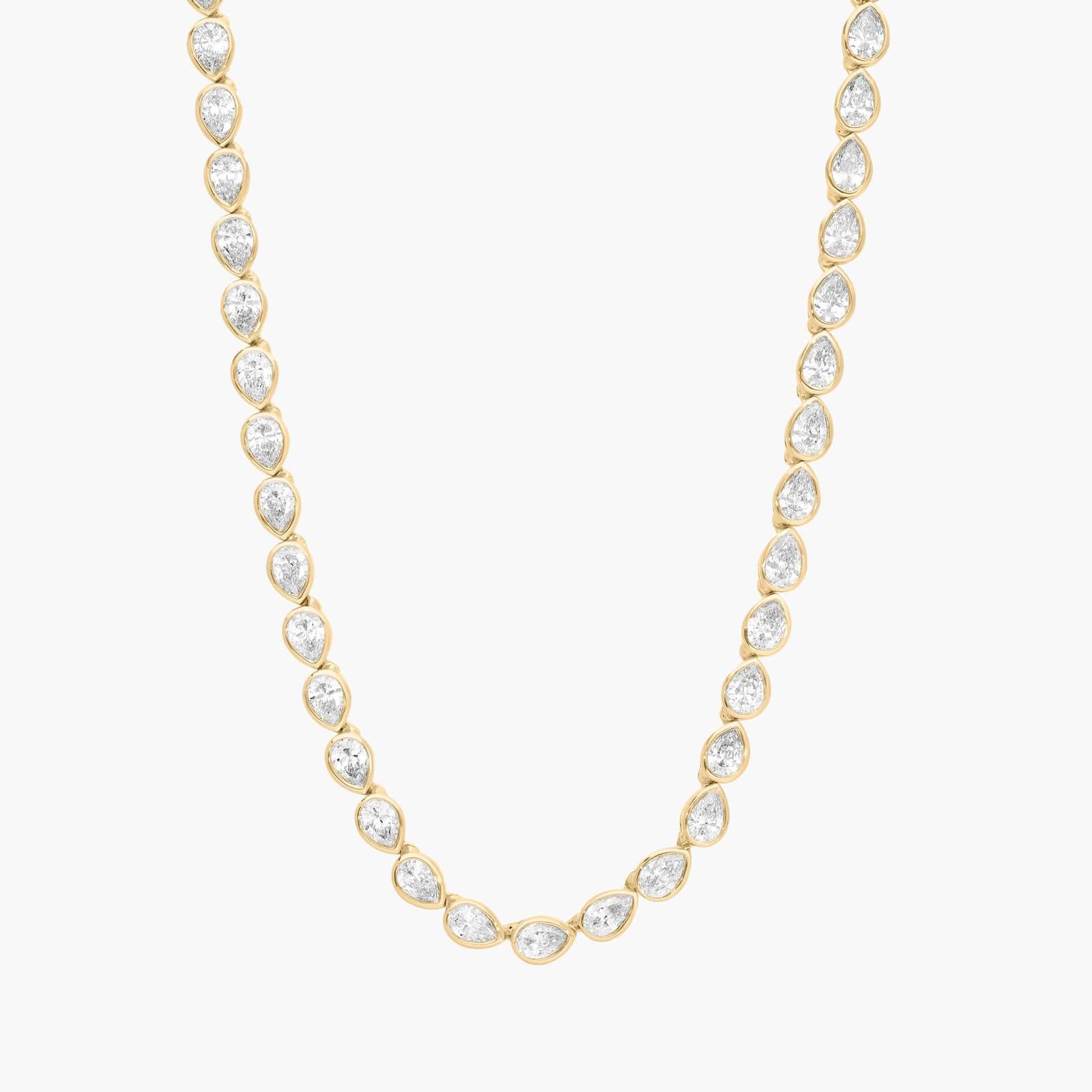 Tennis necklaces are endlessly brilliant and easy to accessorize. This east-west pear shaped lab-grown diamond tennis necklace features 14k yellow gold details and bezel settings for classic style. Wear it as a signature solo piece or as the focal point in a necklace stack. It's also a leading gift for any occasion.