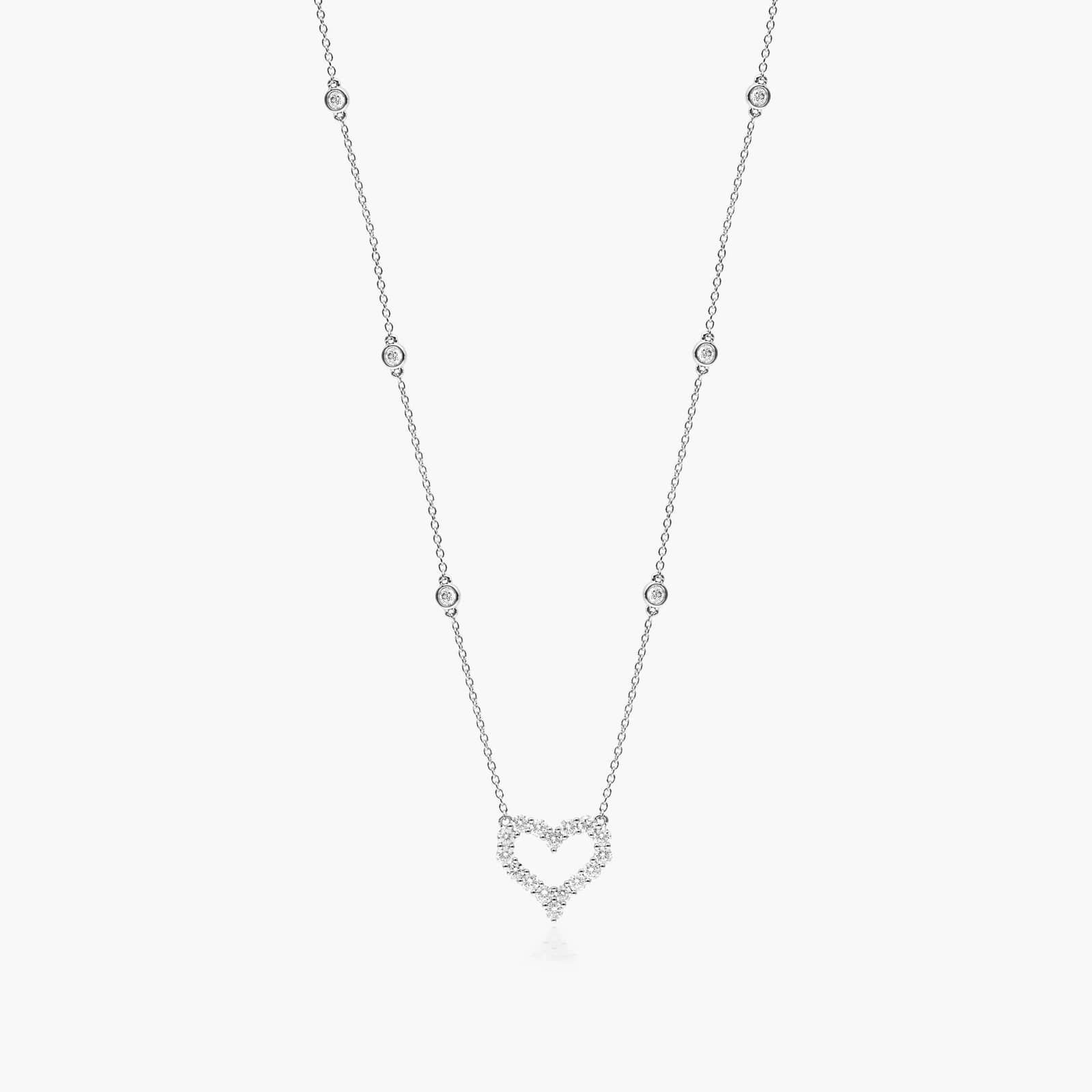 This gorgeous 14K white gold necklace features a heart outline pendant made of sparkly diamonds and bezeled diamond stations as sparkly accents. The perfect token of affection for that special someone.