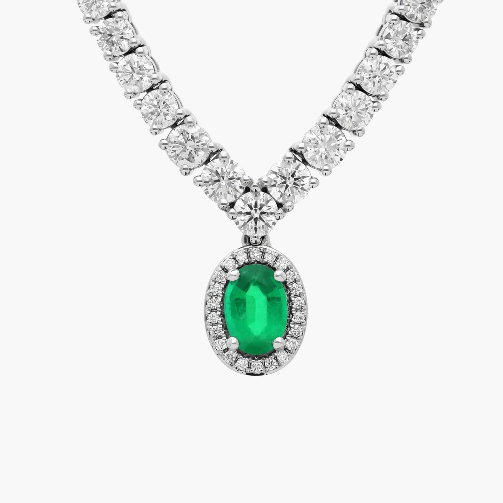 A central oval cut emerald and sparkling diamonds create a stunning necklace that always makes a statement. Dress up your favorite outfit with this exceptional piece. It is designed in 14k gold for long-lasting style.