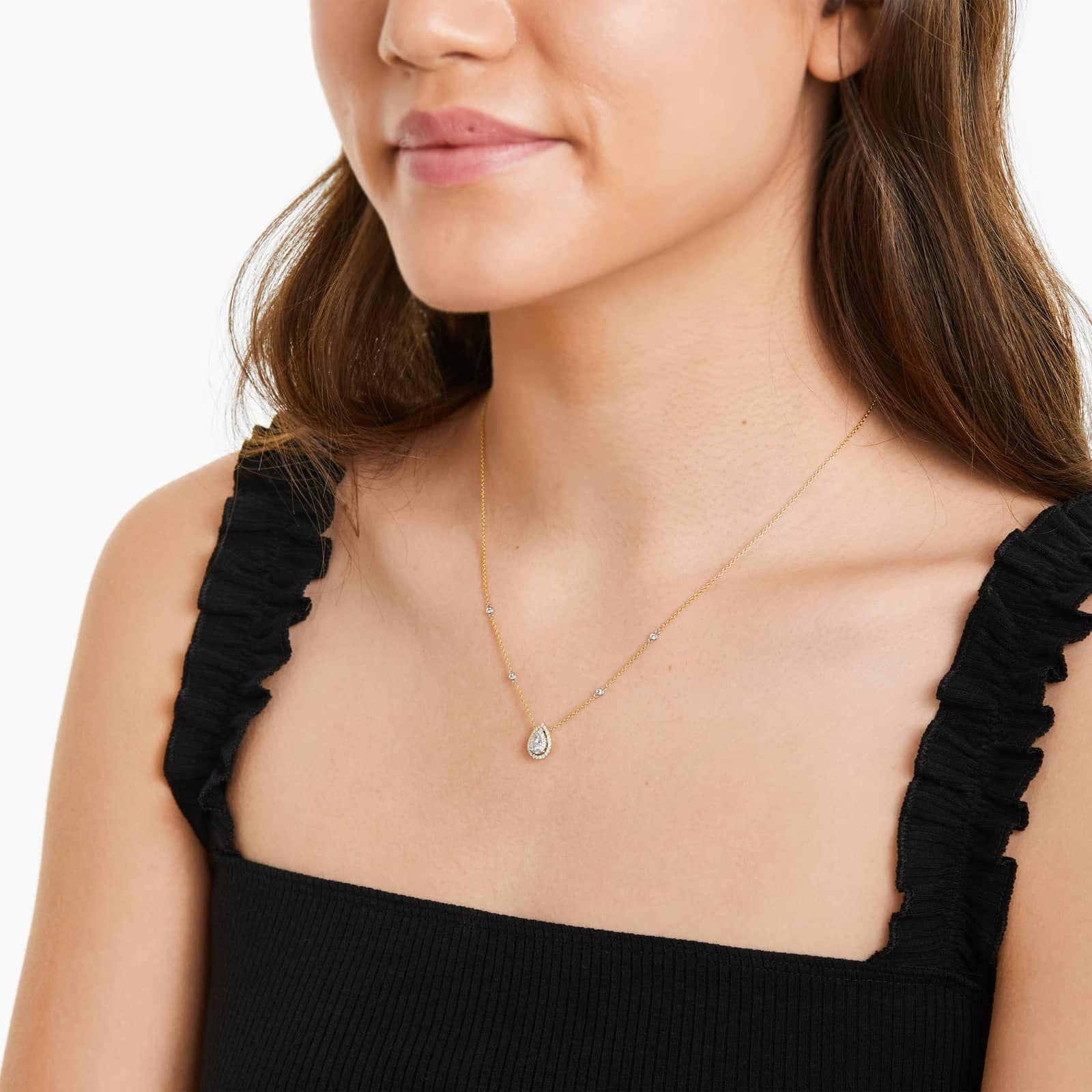 This dainty and elegant pear halo composite pendant is perfect for every day wear. Beautifully crafted and prong set with round brilliant cut diamonds. Suspended by a delicate adjustable chain with four stations of round brilliant cut diamonds bezel set.
