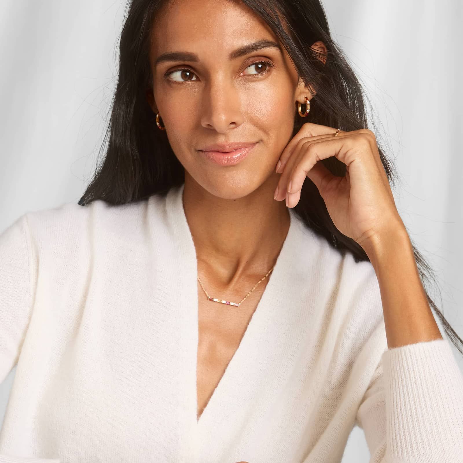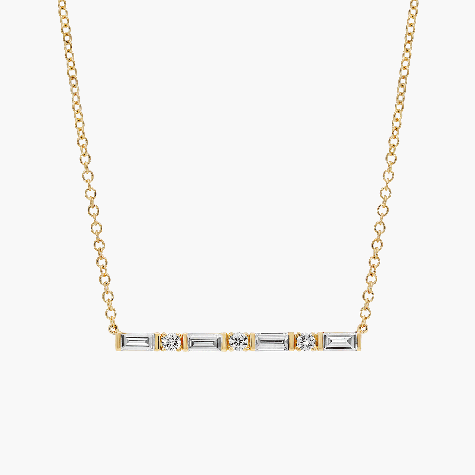 This bar necklace features baguette and round cut gemstones for unique style. It's crafted in 14k yellow gold with lab-grown diamonds and the custom gemstone of your choice. Pick two of 12 birthstones to feature in this personalized necklace. Choose birthstones that represents what's most important to you. This necklace is perfect for layering, styling on its own or giving as a memorable gift.