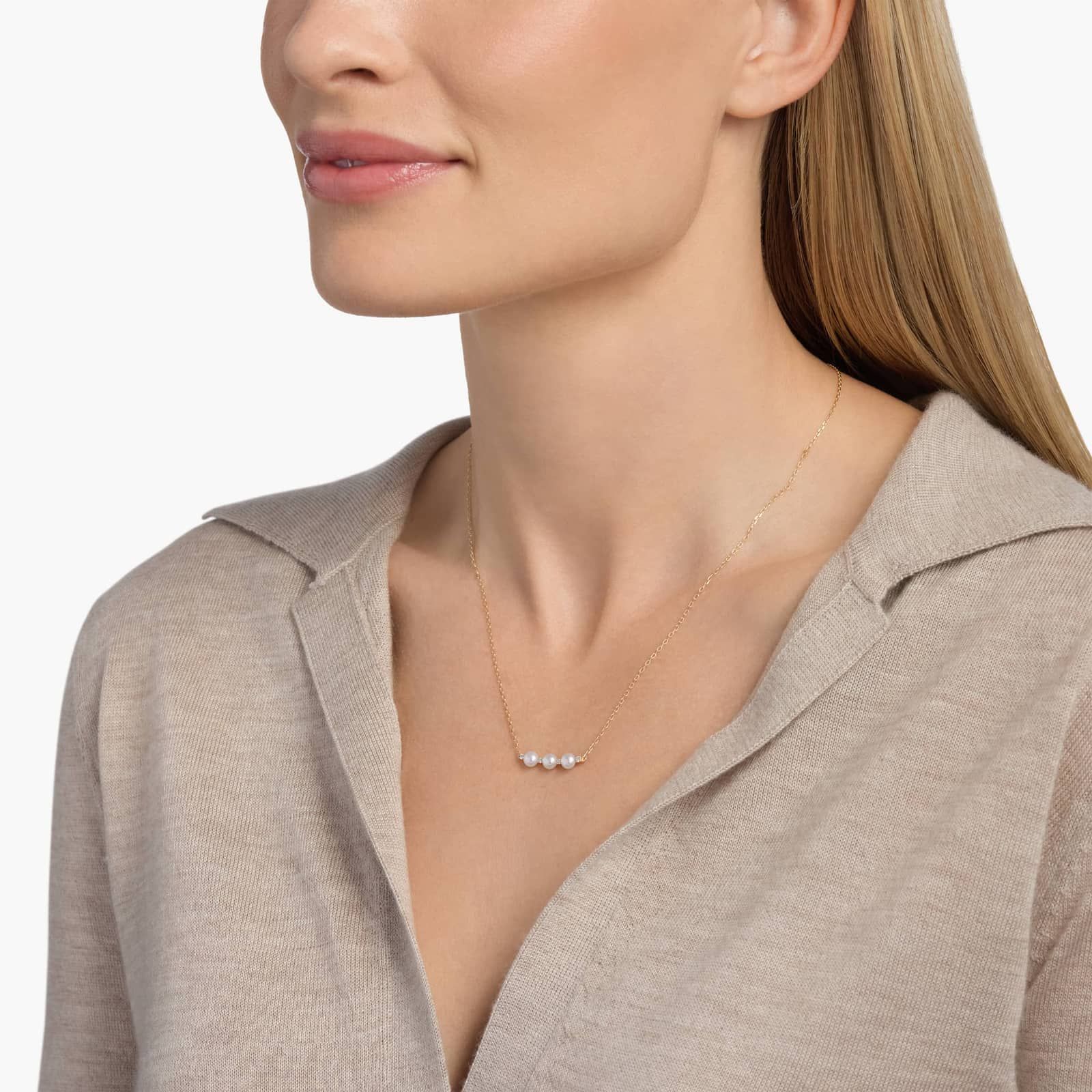 Three pearls gleam along this bar necklace crafted from warmly lustrous 14k yellow gold. Between each pearl, a petite spacer diamond adds a touch of sparkle.