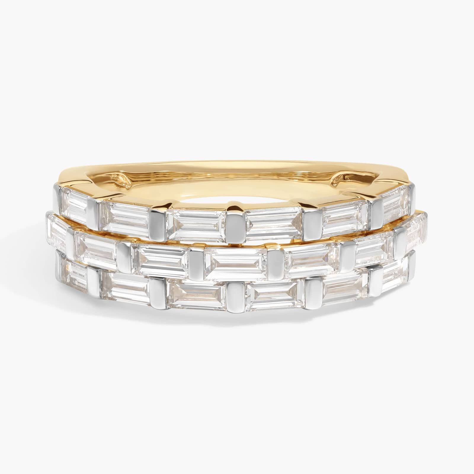 Three rows of baguette cut lab-grown diamonds make this ring a standout piece for any collection. With gold design, it's an effortless piece for celebrating life's special moments.