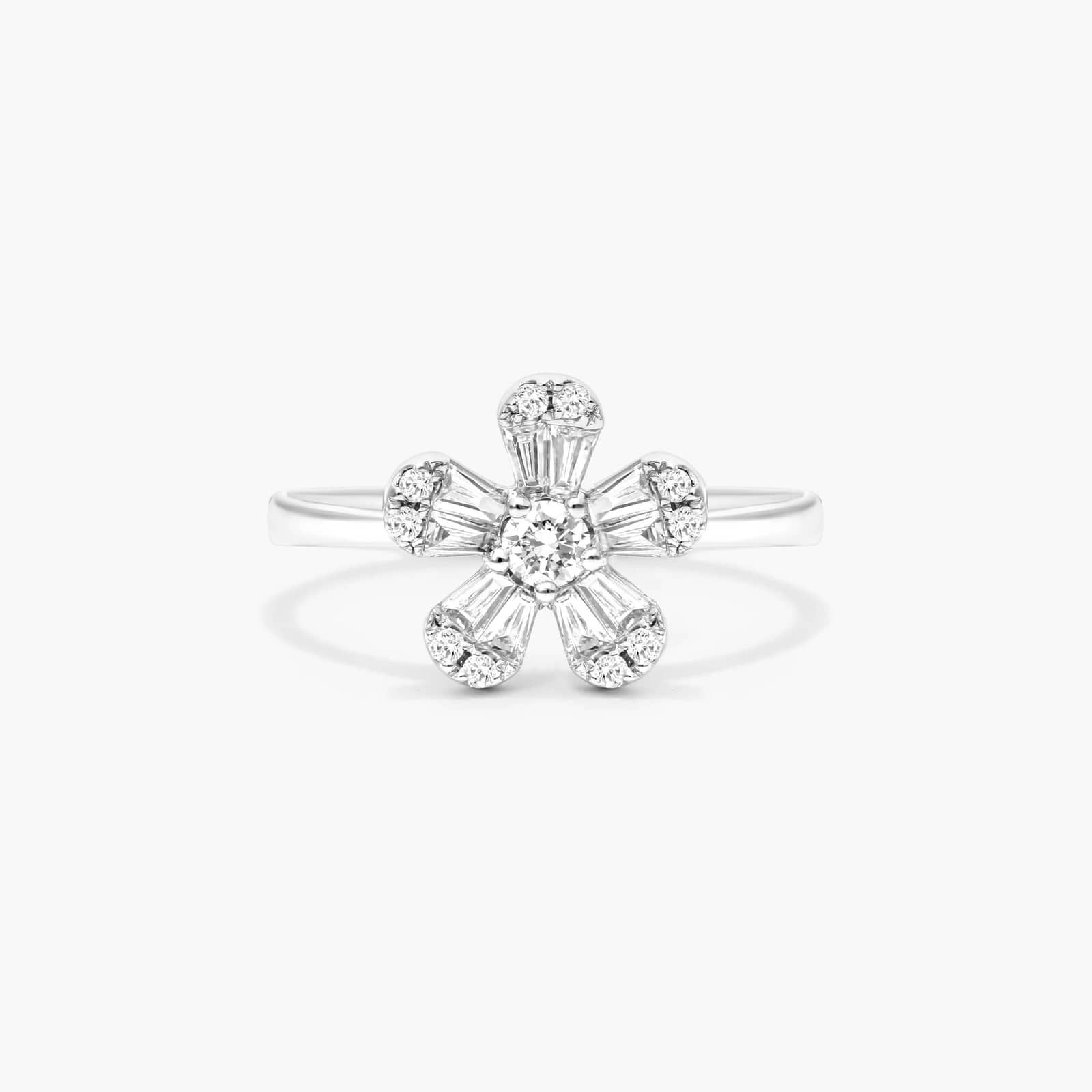 Baguette And Round Diamond Flower Ring In 14K White Gold