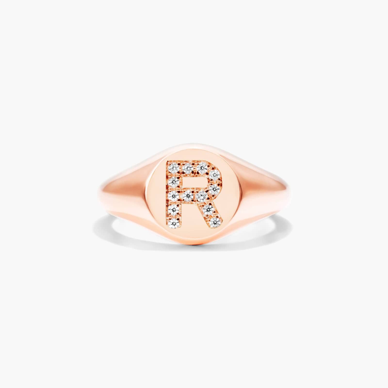 Diamond R Initial Signet Ring In 14K Rose Gold