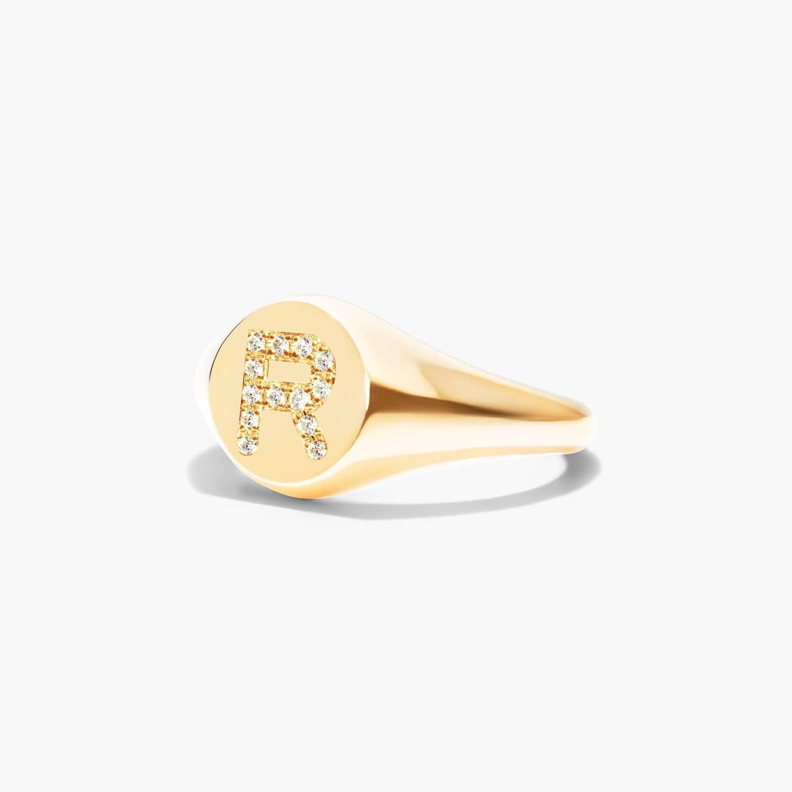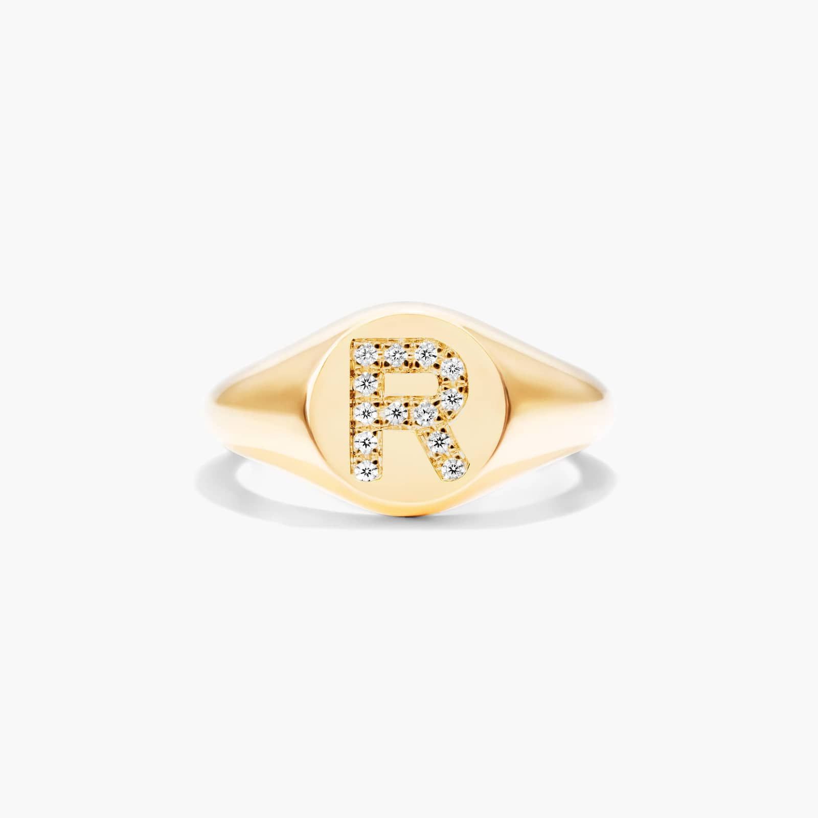 Diamond R Initial Signet Ring In 14K Yellow Gold