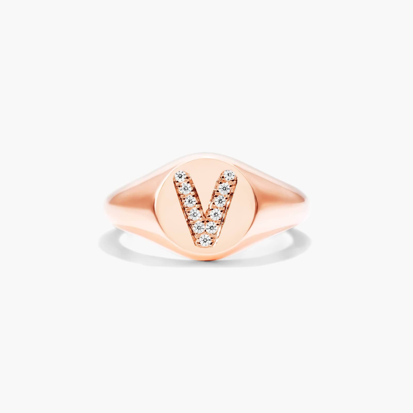 Diamond V Initial Signet Ring In 14K Rose Gold