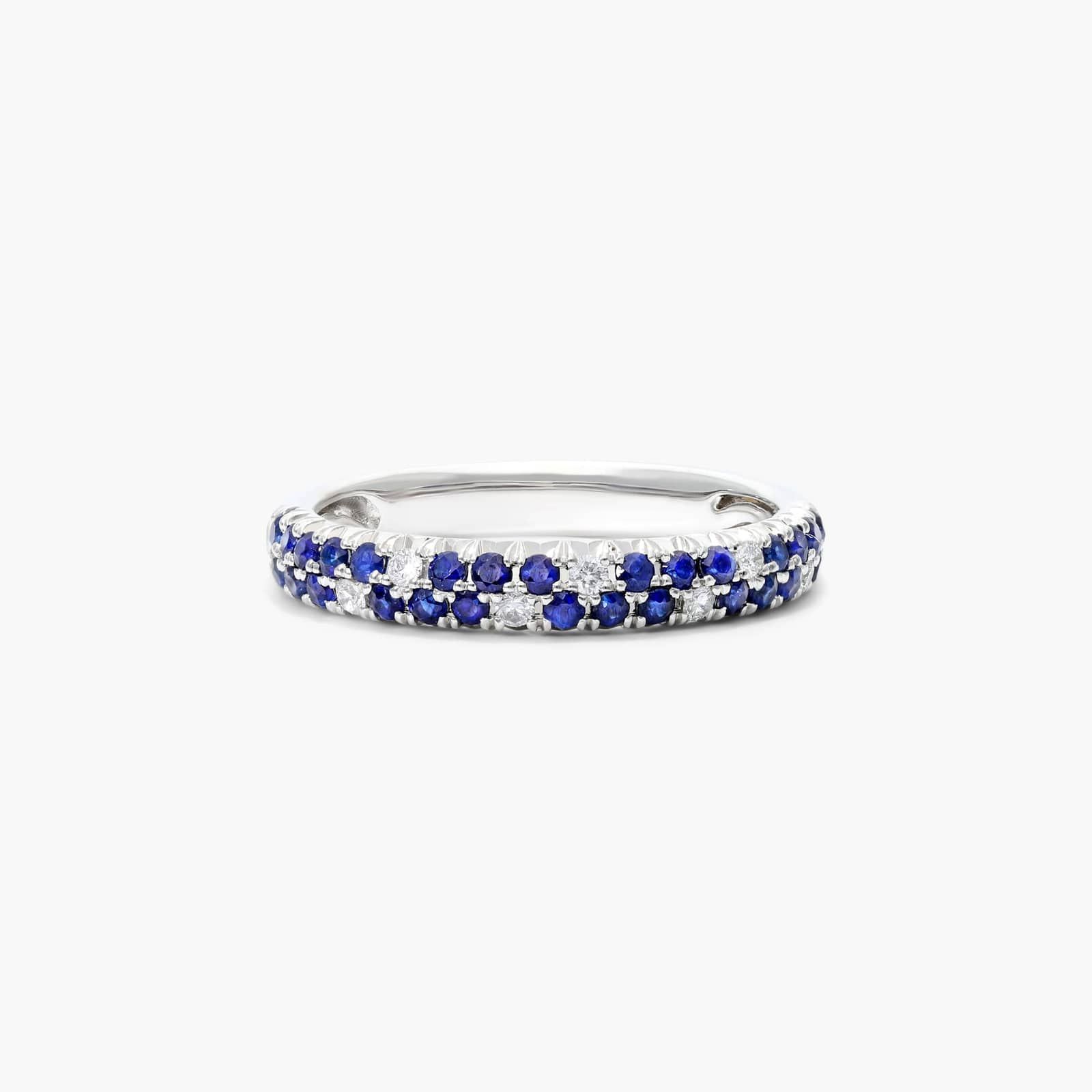 Elegant and modern, this ring features two rows of pavé sapphires with sprinkled round brilliant diamonds set in lustrous white gold.