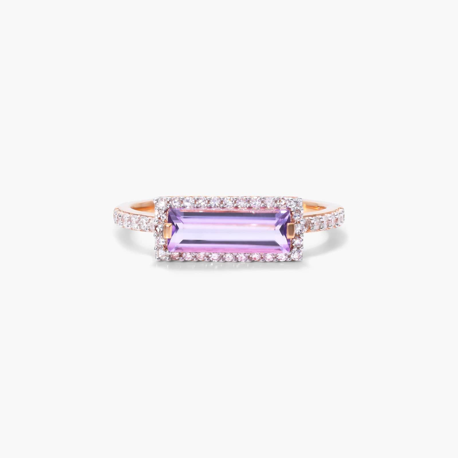 East-West Emerald Cut Amethyst And Diamond Halo Bar Ring In 14K Rose Gold By James Allen
