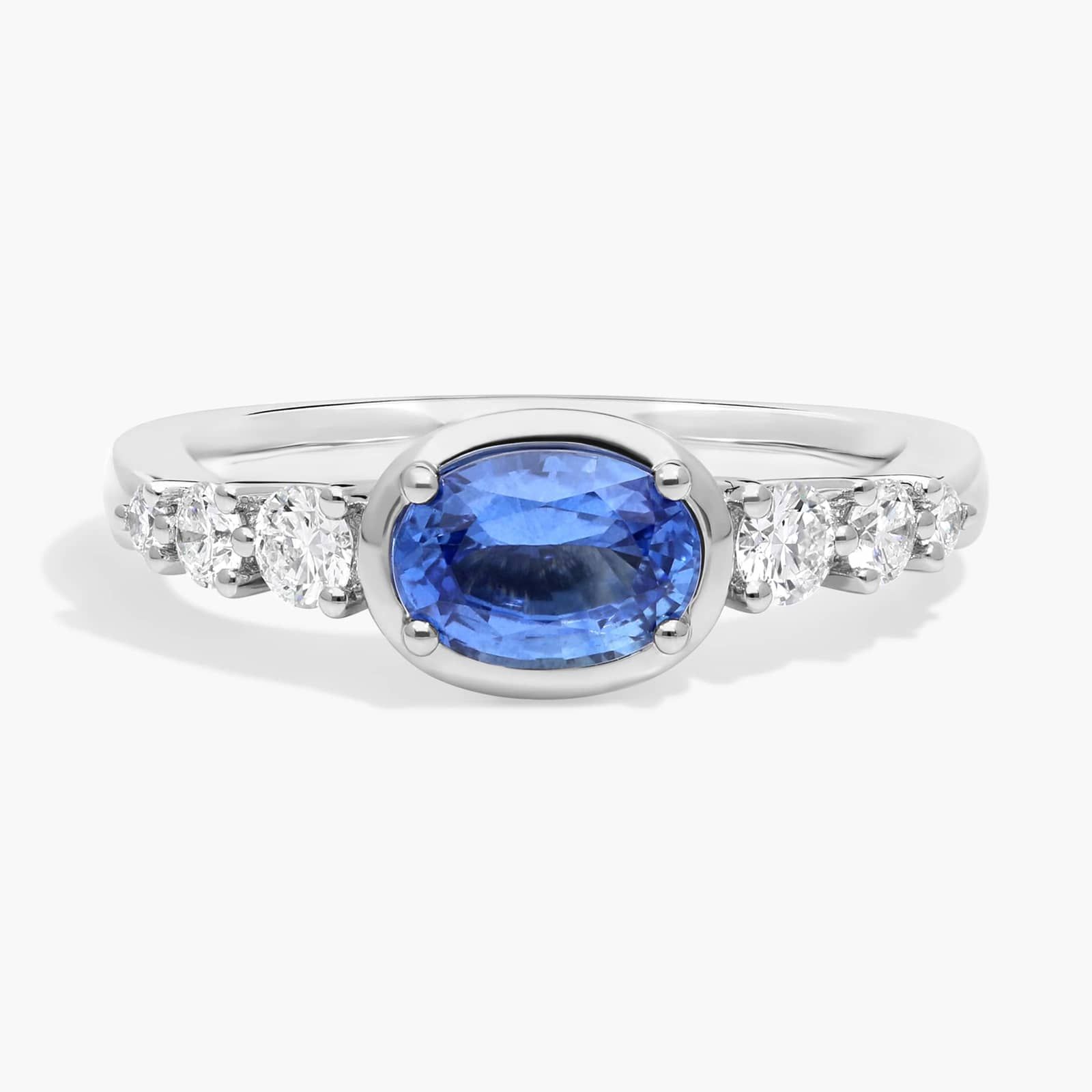 East-West Oval Cut Sapphire Ring With Half Bezel and Diamond Accent In 14K White Gold