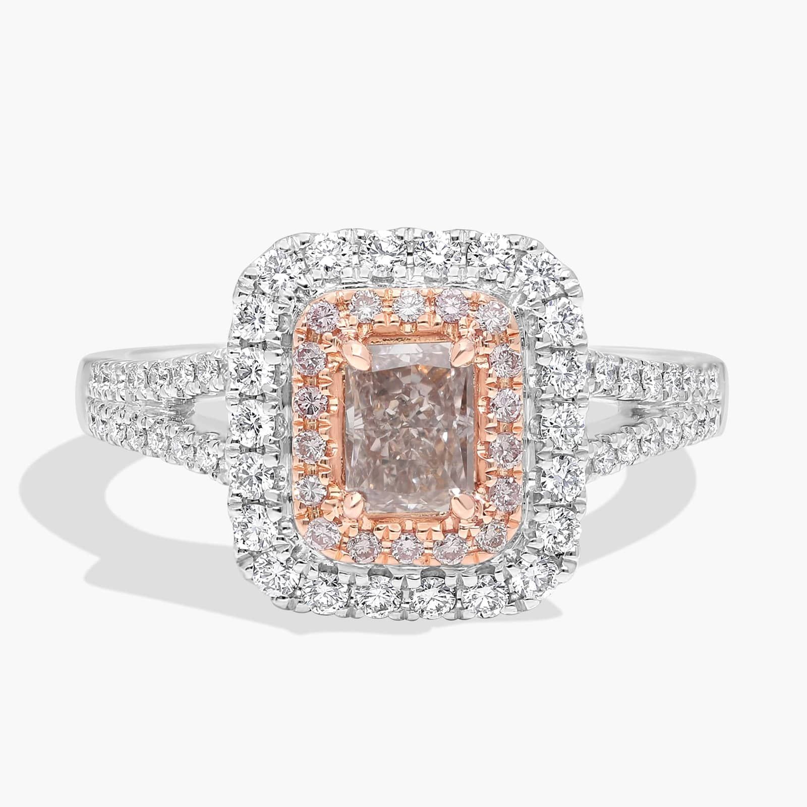 Take their breath away with this one-of-a-kind ring, showcasing a stunning pink radiant diamond nestled at the centre of a sparkling double halo of pink and white diamonds. The platinum and 18k rose gold design promises timeless quality and luxury, and prong-set diamonds lend a touch of shimmer to the shanks. This piece is accompanied by a GIA Certification. GIA Report Number: 2346361195